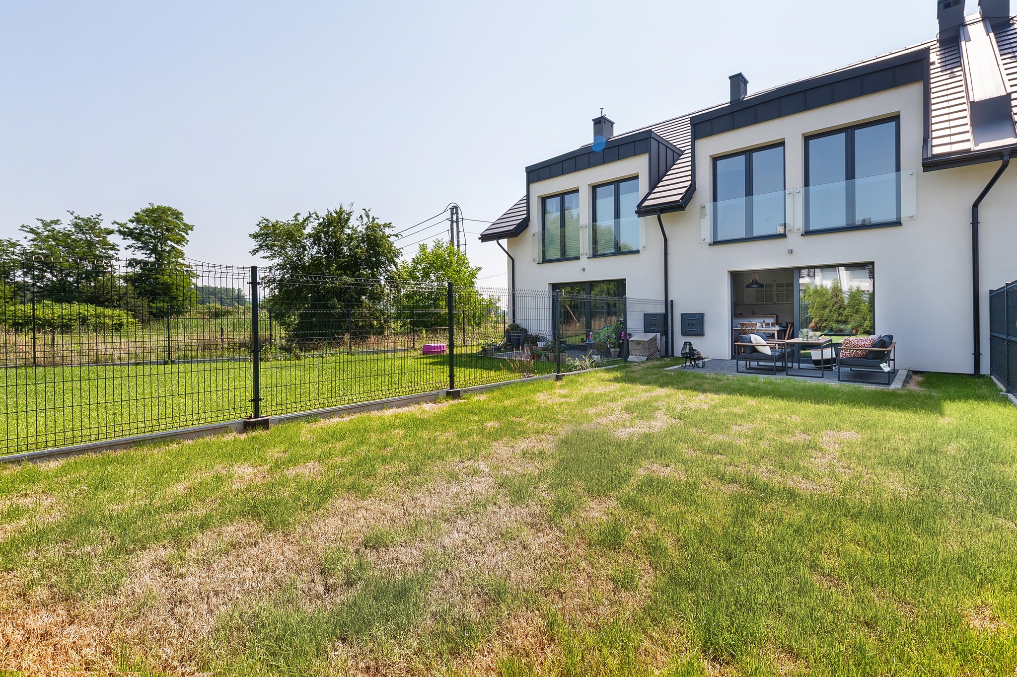 Dodatkowo na parterze znajduje się mała sypialnia z dużymi przeszkleniami, która idealnie sprawdzi się jako pokój dla gości lub gabinet.