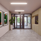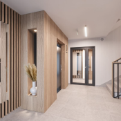 - Eleganckie części wspólne. Korytarze wykończone zostały dekoracyjnymi tapetami i elementami w kolorze drewna. Ściany zdobią podświetlane lustra i grafiki stworzone specjalnie dla budynku i jej mieszkańców przez polską ilustratorkę.