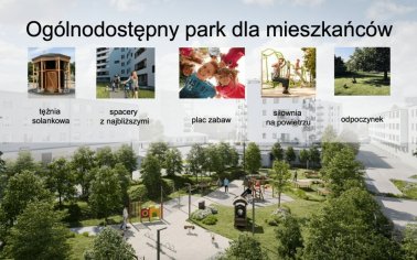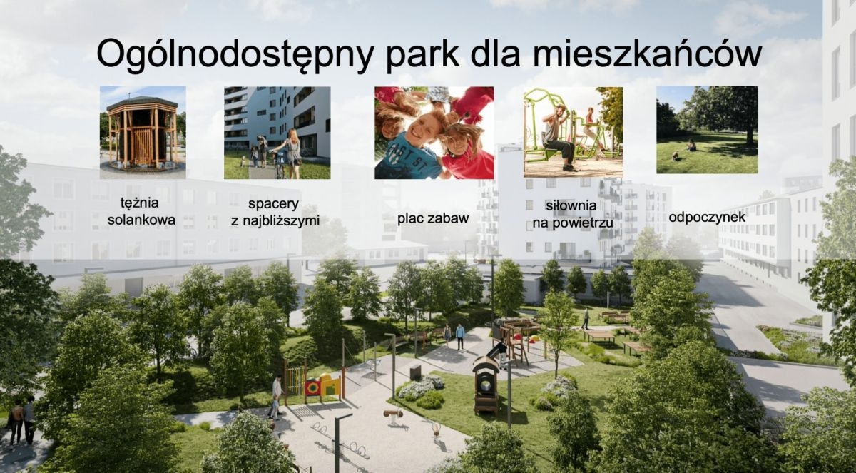 - Ogólnodostępny park, plac zabaw, siłownia zewnętrzna, stoły do gier i tężnia, część terenu parkowego przeznaczono na łąkę kwietną,