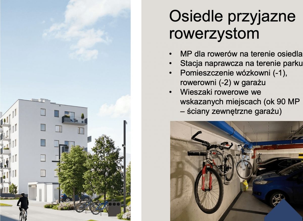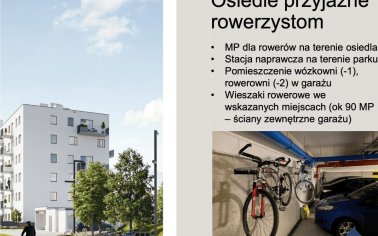 - Stojaki rowerowe na zewnątrz budynku, dwupoziomowy garaż pod budynkiem,