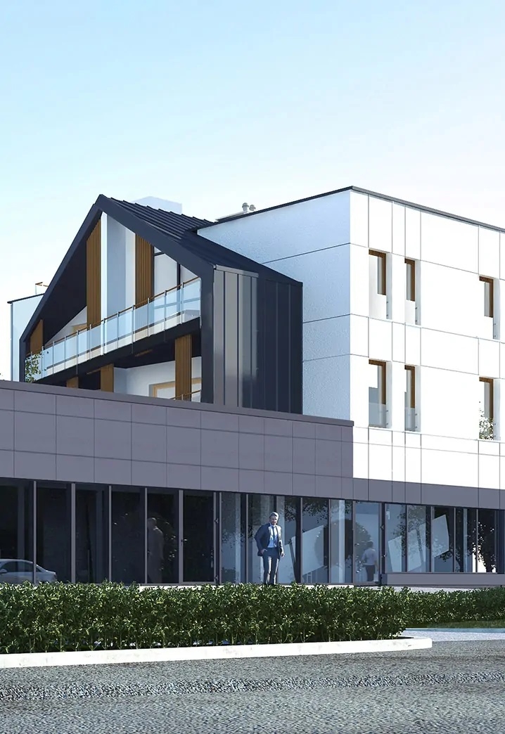 Duo Apartamenty to pionierski projekt na białostockim rynku nieruchomości – mariaż architektury tradycyjnej z nowoczesną. Proste formy budynków i dwuspadowe dachy to elementy charakterystyczne nowej inwestycji, która spaja się z otoczeniem.