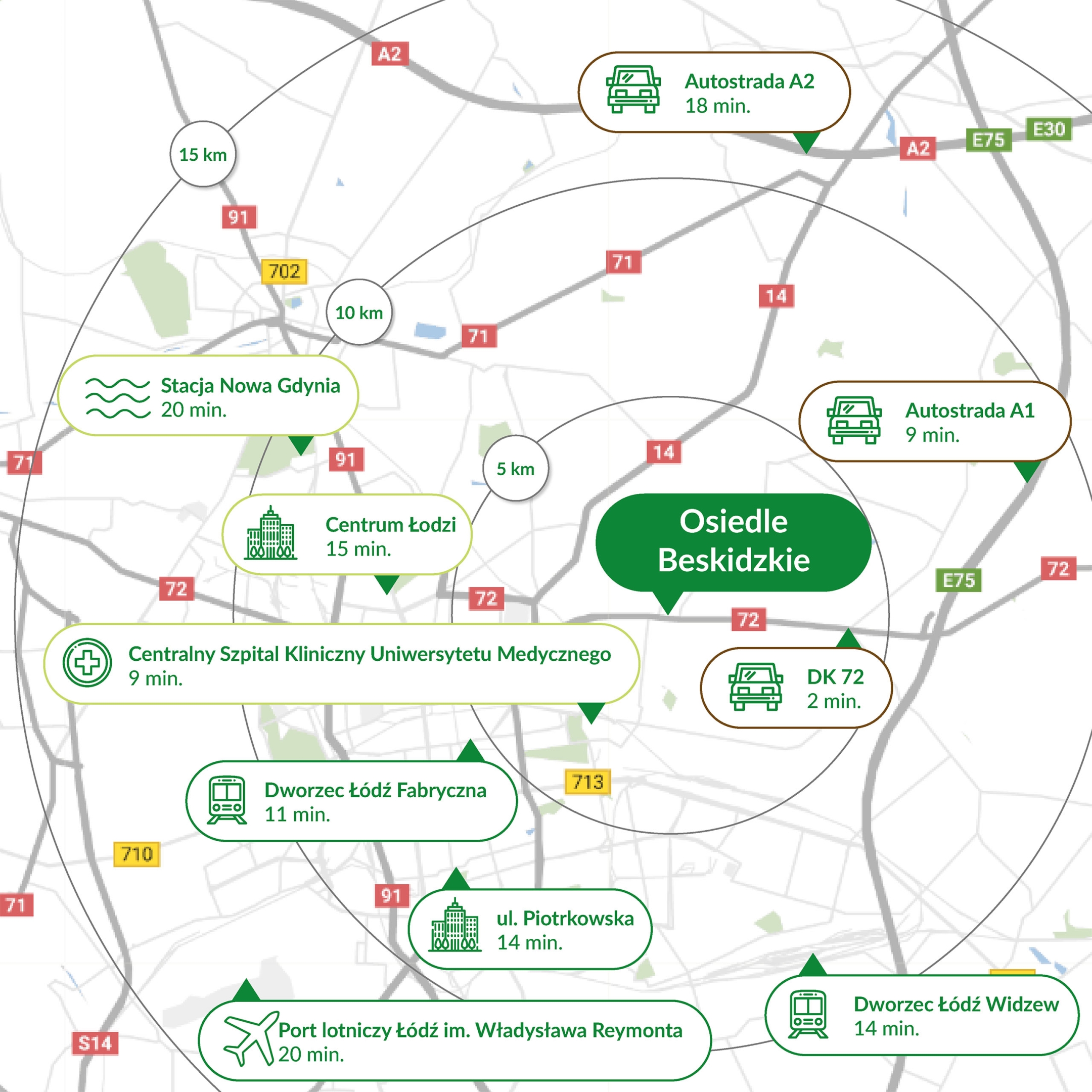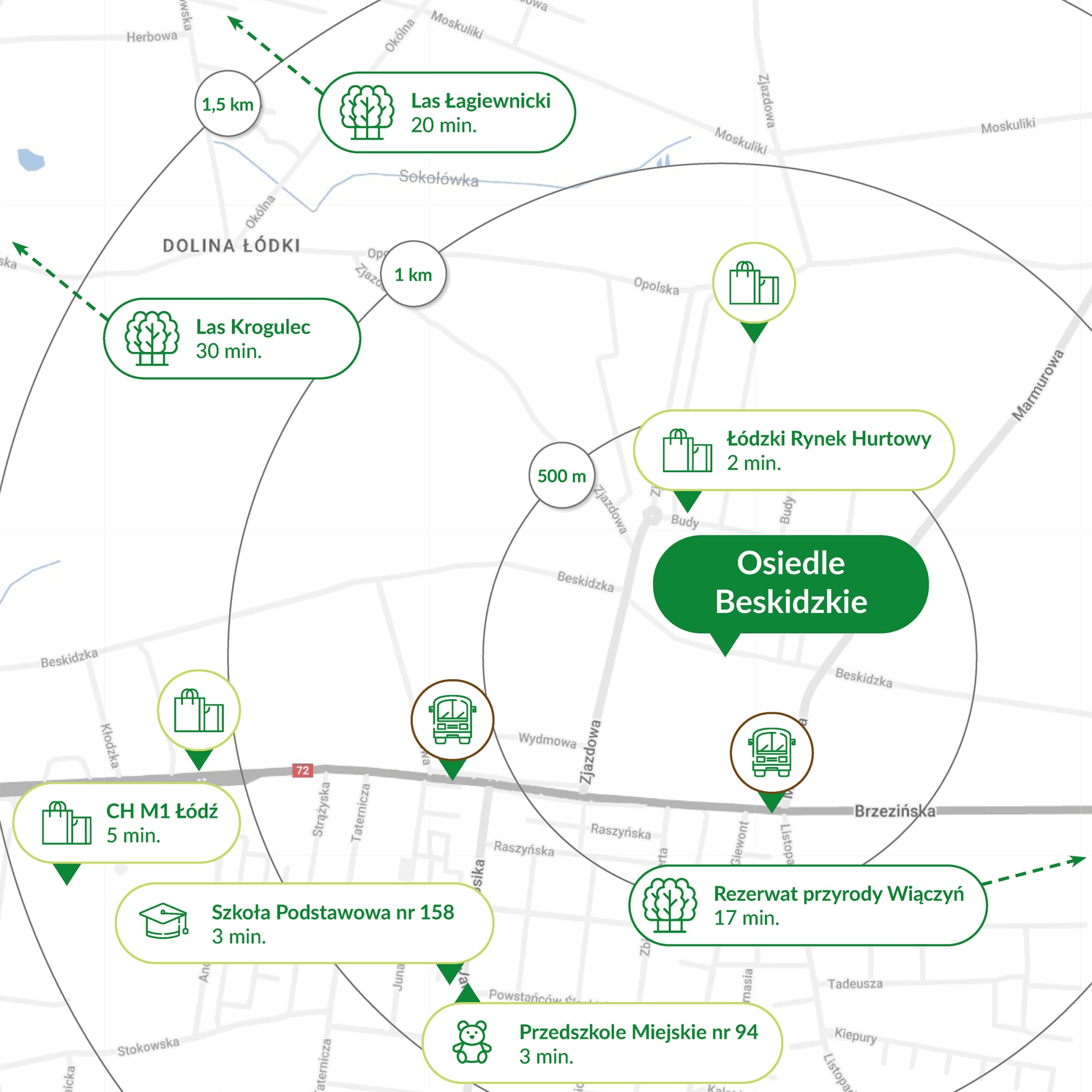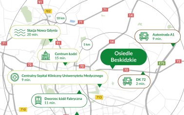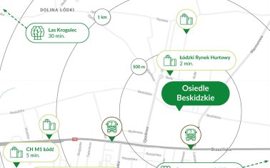 Inwestycja Osiedle Beskidzkie znajduje się na Dolinie Łódki, ul. Beskidzka 117 (6.9 km od centrum Łodzi), jest realizowana przez JR Beskidzka.