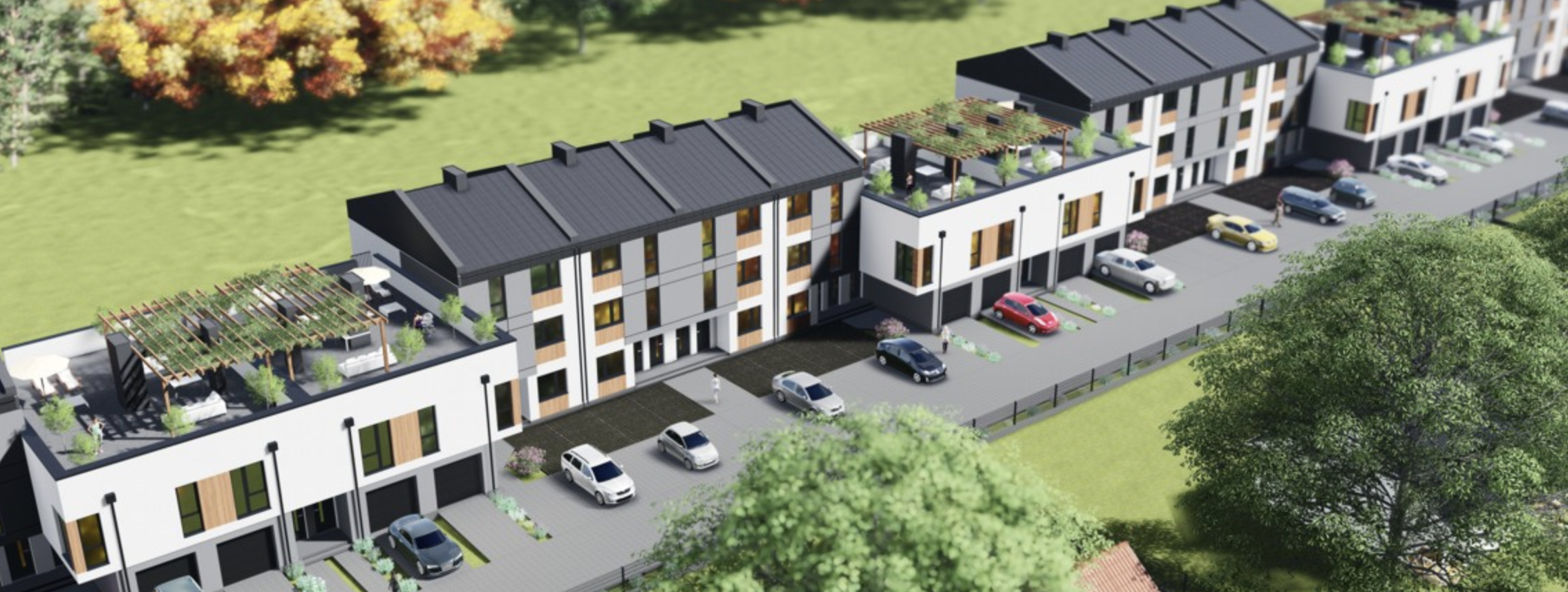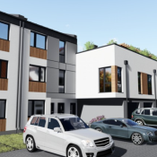 - mieszkania górne jednopoziomowe z garażem i dużym, ponad 100 metrowym tarasem na dachu. Mieszkania są 4 pokojowe.