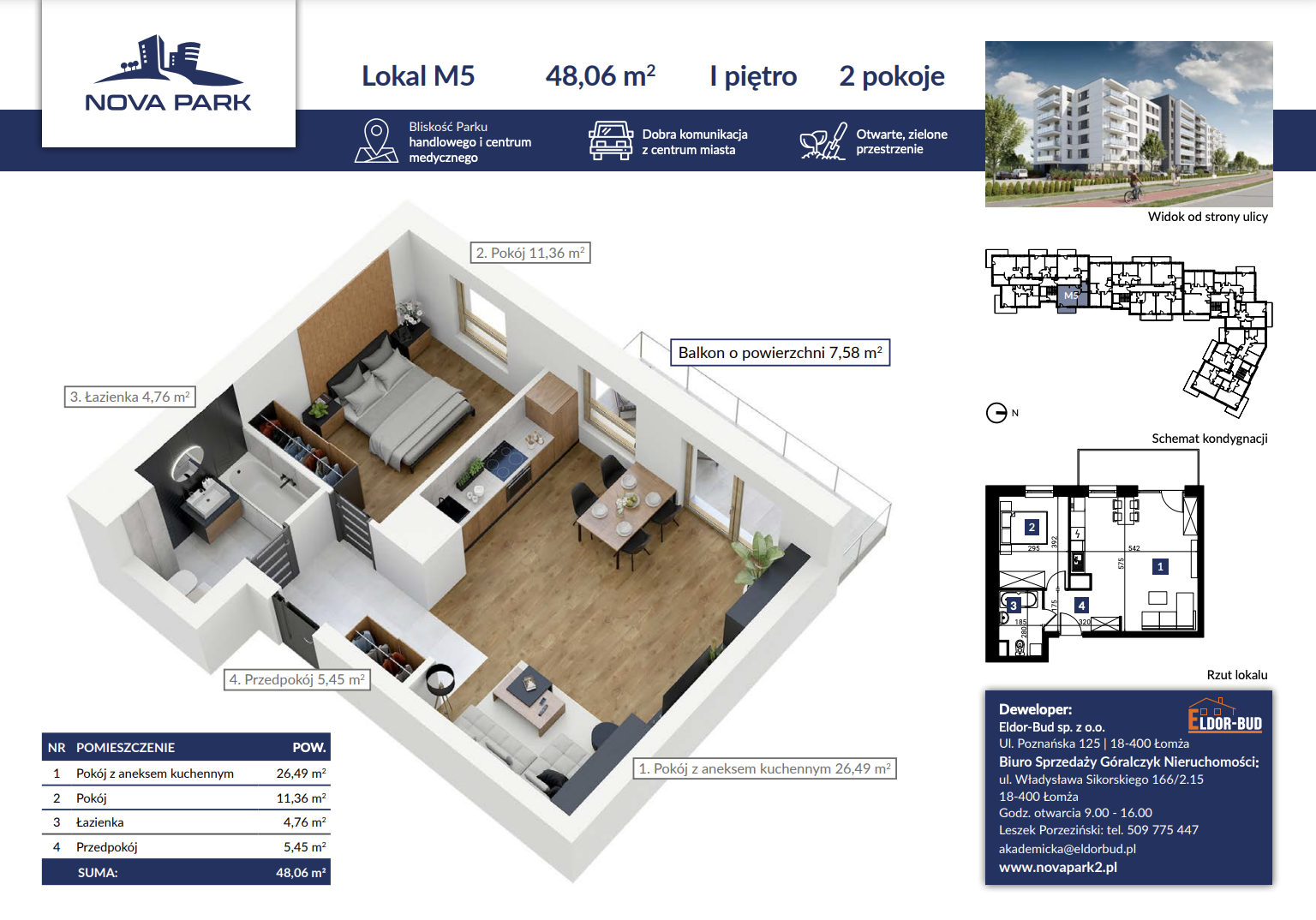 Nova Park znajduje się przy ul. Akademickiej w Łomży. Lokalizacja ta gwarantuje codzienną wygodę w dojeździe do pracy, szkoły, na uczelnię, zakupy czy do wielu wyjątkowych miejsc rekreacji. Niedaleko m.in. kilka przystanków autobusowych oraz kluczowych tras dojazdowych, ułatwiających dostęp do każdej części Łomży. W jej ścisłym centrum można znaleźć się w mniej niż 7 minut. W pobliżu inwestycji nie brakuje również rozległych terenów zielonych, idealnych na długie spacery, jogging czy wycieczki rowerowe.