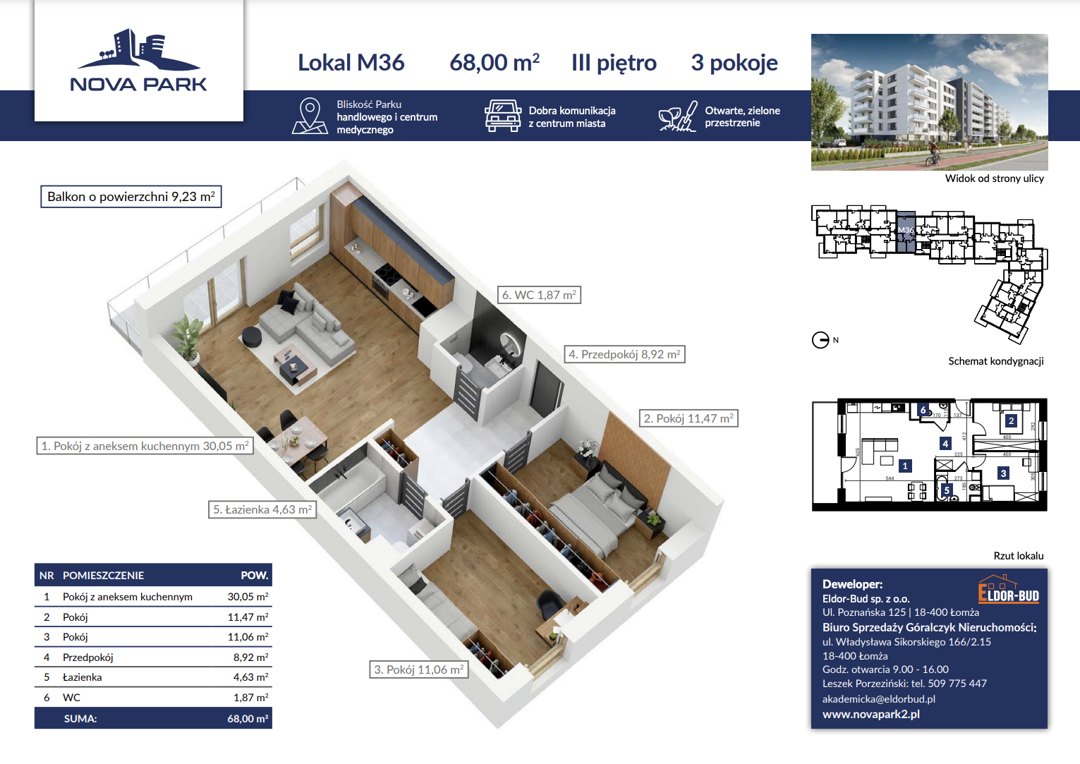 Nova Park znajduje się przy ul. Akademickiej w Łomży. Lokalizacja ta gwarantuje codzienną wygodę w dojeździe do pracy, szkoły, na uczelnię, zakupy czy do wielu wyjątkowych miejsc rekreacji. Niedaleko m.in. kilka przystanków autobusowych oraz kluczowych tras dojazdowych, ułatwiających dostęp do każdej części Łomży. W jej ścisłym centrum można znaleźć się w mniej niż 7 minut. W pobliżu inwestycji nie brakuje również rozległych terenów zielonych, idealnych na długie spacery, jogging czy wycieczki rowerowe.