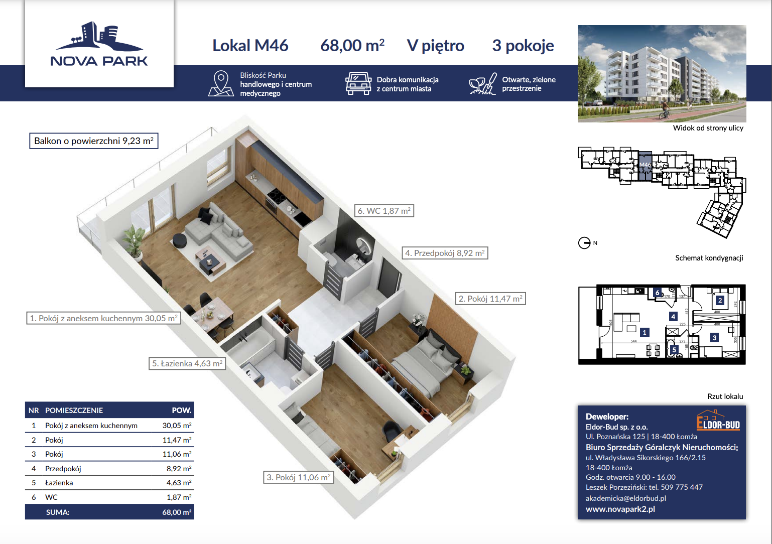 Nova Park znajduje się przy ul. Akademickiej w Łomży. Lokalizacja ta gwarantuje codzienną wygodę w dojeździe do pracy, szkoły, na uczelnię, zakupy czy do wielu wyjątkowych miejsc rekreacji. Niedaleko m.in. kilka przystanków autobusowych oraz kluczowych tras dojazdowych, ułatwiających dostęp do każdej części Łomży. W jej ścisłym centrum można znaleźć się w mniej niż 7 minut. W pobliżu inwestycji nie brakuje również rozległych terenów zielonych, idealnych na długie spacery, jogging czy wycieczki rowerowe.