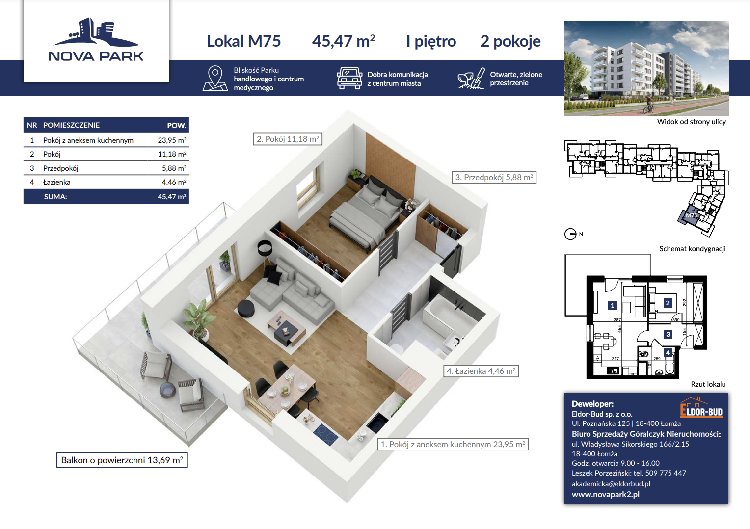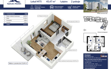 Nova Park znajduje się przy ul. Akademickiej w Łomży. Lokalizacja ta gwarantuje codzienną wygodę w dojeździe do pracy, szkoły, na uczelnię, zakupy czy do wielu wyjątkowych miejsc rekreacji. Niedaleko m.in. kilka przystanków autobusowych oraz kluczowych tras dojazdowych, ułatwiających dostęp do każdej części Łomży. W jej ścisłym centrum można znaleźć się w mniej niż 7 minut. W pobliżu inwestycji nie brakuje również rozległych terenów zielonych, idealnych na długie spacery, jogging czy wycieczki rowerowe.