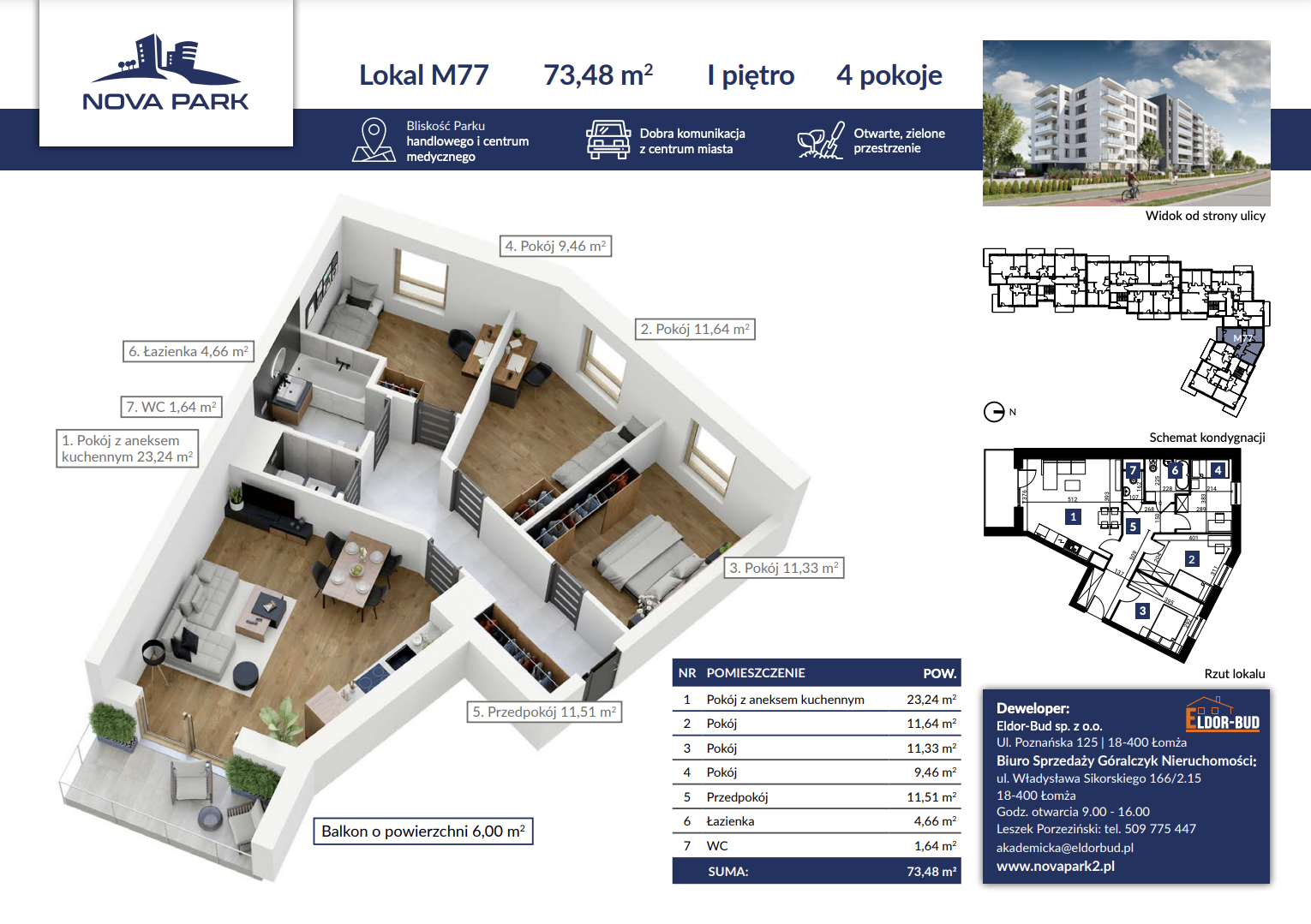 Nova Park znajduje się przy ul. Akademickiej w Łomży. Lokalizacja ta gwarantuje codzienną wygodę w dojeździe do pracy, szkoły, na uczelnię, zakupy czy do wielu wyjątkowych miejsc rekreacji. Niedaleko m.in. kilka przystanków autobusowych oraz kluczowych tras dojazdowych, ułatwiających dostęp do każdej części Łomży. W jej ścisłym centrum można znaleźć się w mniej niż 7 minut. W pobliżu inwestycji nie brakuje również rozległych terenów zielonych, idealnych na długie spacery, jogging czy wycieczki rowerowe.
