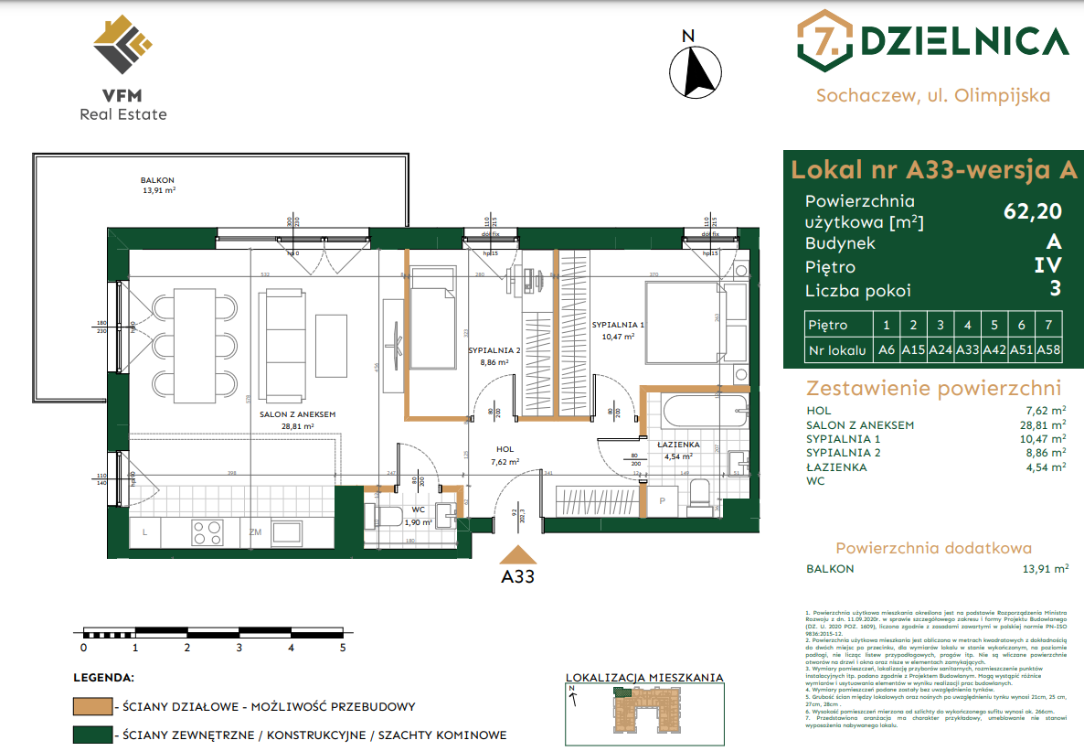 Sochaczew to miasto przyjazne, otwarte i nowoczesne. Taka jest Inwestycja deweloperska w centrum miasta - 7. Dzielnica, projekt realizowany przez VFM Real Estate. Inwestycja zlokalizowana tuż obok miejskiego ośrodka sportu i rekreacji. W ciągu kilku lat powstanie tu najnowocześniejsze osiedle w Sochaczewie - nowe tętno miasta.Dzielnica Olimpijska to teren wyposażony w strefy rekreacyjne dla komfortowego życia jej mieszkańców. Inwestycja zakłada realizację osiedla złożonego z 5 budynków mieszkalnych. Do dyspozycji mieszkańców będą liczne miejsca parkingowe naziemne oraz garaż podziemny, praktyczne stojaki na rowery i bezpieczna wózkownia. Dodatkowo na terenie osiedla znajdzie się stacja do ładowania pojazdów elektrycznych, paczkomat, parkingi na rowery oraz lokale usługowe. Wyróżnikiem inwestycji są tereny rekreacyjne, plac zabaw i zielone skwery.