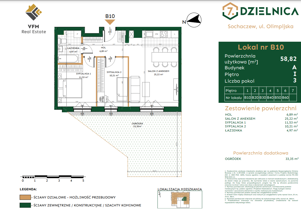 Sochaczew to miasto przyjazne, otwarte i nowoczesne. Taka jest Inwestycja deweloperska w centrum miasta - 7. Dzielnica, projekt realizowany przez VFM Real Estate. Inwestycja zlokalizowana tuż obok miejskiego ośrodka sportu i rekreacji. W ciągu kilku lat powstanie tu najnowocześniejsze osiedle w Sochaczewie - nowe tętno miasta.Dzielnica Olimpijska to teren wyposażony w strefy rekreacyjne dla komfortowego życia jej mieszkańców. Inwestycja zakłada realizację osiedla złożonego z 5 budynków mieszkalnych. Do dyspozycji mieszkańców będą liczne miejsca parkingowe naziemne oraz garaż podziemny, praktyczne stojaki na rowery i bezpieczna wózkownia. Dodatkowo na terenie osiedla znajdzie się stacja do ładowania pojazdów elektrycznych, paczkomat, parkingi na rowery oraz lokale usługowe. Wyróżnikiem inwestycji są tereny rekreacyjne, plac zabaw i zielone skwery.