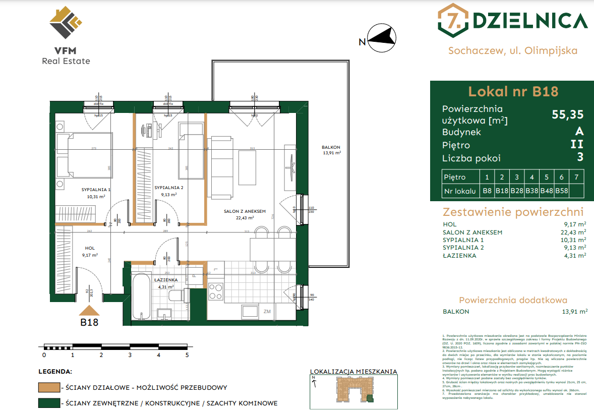 Sochaczew to miasto przyjazne, otwarte i nowoczesne. Taka jest Inwestycja deweloperska w centrum miasta - 7. Dzielnica, projekt realizowany przez VFM Real Estate. Inwestycja zlokalizowana tuż obok miejskiego ośrodka sportu i rekreacji. W ciągu kilku lat powstanie tu najnowocześniejsze osiedle w Sochaczewie - nowe tętno miasta.Dzielnica Olimpijska to teren wyposażony w strefy rekreacyjne dla komfortowego życia jej mieszkańców. Inwestycja zakłada realizację osiedla złożonego z 5 budynków mieszkalnych. Do dyspozycji mieszkańców będą liczne miejsca parkingowe naziemne oraz garaż podziemny, praktyczne stojaki na rowery i bezpieczna wózkownia. Dodatkowo na terenie osiedla znajdzie się stacja do ładowania pojazdów elektrycznych, paczkomat, parkingi na rowery oraz lokale usługowe. Wyróżnikiem inwestycji są tereny rekreacyjne, plac zabaw i zielone skwery.