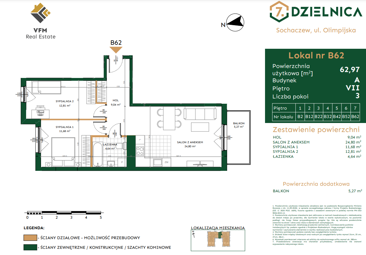 Sochaczew to miasto przyjazne, otwarte i nowoczesne. Taka jest Inwestycja deweloperska w centrum miasta - 7. Dzielnica, projekt realizowany przez VFM Real Estate. Inwestycja zlokalizowana tuż obok miejskiego ośrodka sportu i rekreacji. W ciągu kilku lat powstanie tu najnowocześniejsze osiedle w Sochaczewie - nowe tętno miasta.Dzielnica Olimpijska to teren wyposażony w strefy rekreacyjne dla komfortowego życia jej mieszkańców. Inwestycja zakłada realizację osiedla złożonego z 5 budynków mieszkalnych. Do dyspozycji mieszkańców będą liczne miejsca parkingowe naziemne oraz garaż podziemny, praktyczne stojaki na rowery i bezpieczna wózkownia. Dodatkowo na terenie osiedla znajdzie się stacja do ładowania pojazdów elektrycznych, paczkomat, parkingi na rowery oraz lokale usługowe. Wyróżnikiem inwestycji są tereny rekreacyjne, plac zabaw i zielone skwery.