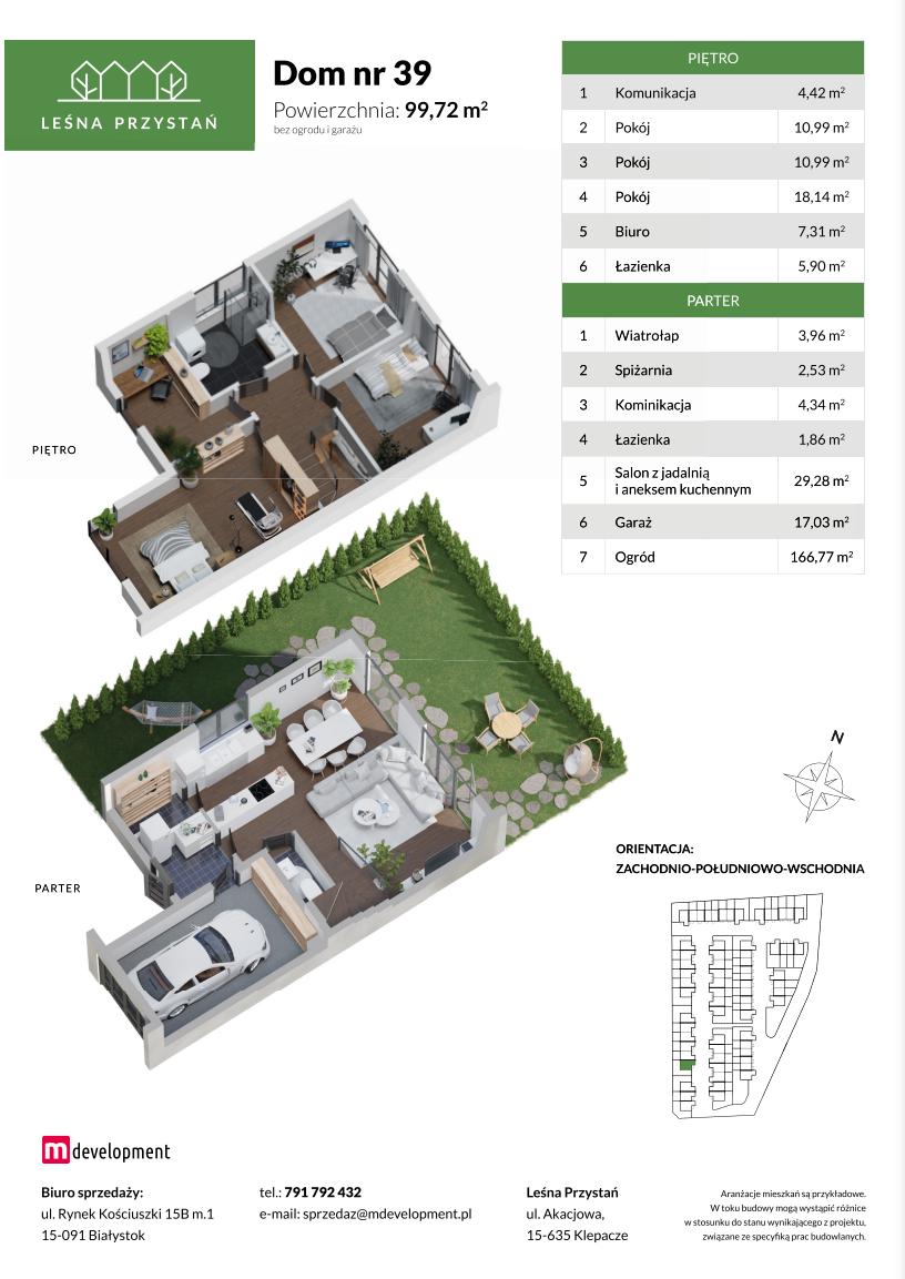 Swoją bezpieczną przystań znajdą tu osoby pragnące uciec od zgiełku miasta, marzące o własnym ogrodzie, chcące obcować z otaczającą naturą, ale jednocześnie pozostając w doskonałej komunikacji ze wszystkimi dobrami aglomeracji miejskiej. Zaledwie 12 minut jazdy samochodem zajmie dostanie się na białostocki deptak, zaś aż o połowę skrócimy czas podróży, wybierając przejazd pobliską koleją.