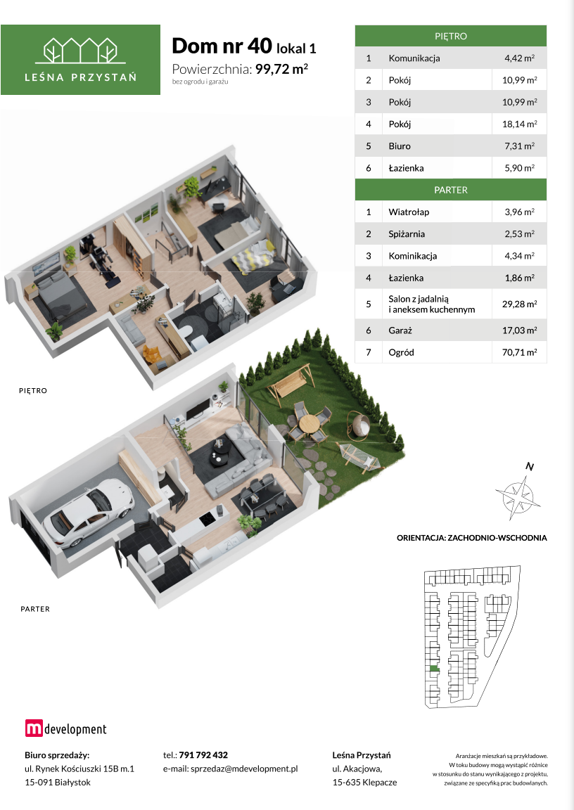 Swoją bezpieczną przystań znajdą tu osoby pragnące uciec od zgiełku miasta, marzące o własnym ogrodzie, chcące obcować z otaczającą naturą, ale jednocześnie pozostając w doskonałej komunikacji ze wszystkimi dobrami aglomeracji miejskiej. Zaledwie 12 minut jazdy samochodem zajmie dostanie się na białostocki deptak, zaś aż o połowę skrócimy czas podróży, wybierając przejazd pobliską koleją.