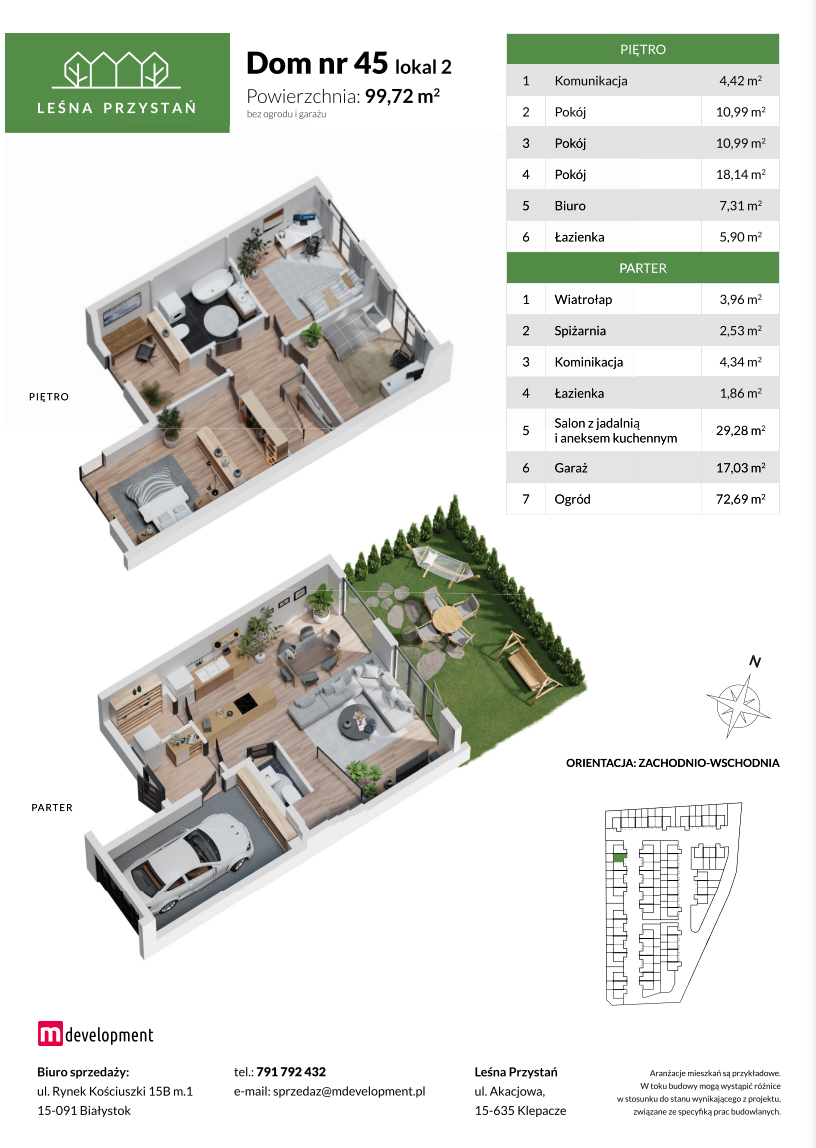 Swoją bezpieczną przystań znajdą tu osoby pragnące uciec od zgiełku miasta, marzące o własnym ogrodzie, chcące obcować z otaczającą naturą, ale jednocześnie pozostając w doskonałej komunikacji ze wszystkimi dobrami aglomeracji miejskiej. Zaledwie 12 minut jazdy samochodem zajmie dostanie się na białostocki deptak, zaś aż o połowę skrócimy czas podróży, wybierając przejazd pobliską koleją.