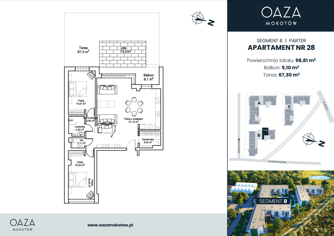 Inwestycja Oaza Mokotów zlokalizowana jest w ścisłym centrum Mokotowa, przy ulicy Piaseczyńskiej 41, w sąsiedztwie terenów zielonych oraz rekreacyjnych Klubu Sportowego Warszawianka – boiska sportowe, korty tenisowe oraz Park Wodny ze strefą Spa & Wellness. Od strony zachodniej nieruchomość przylega do przepięknej skarpy o wysokości kilkunastu metrów oraz naturalnego stawu. W pobliżu znajdują się liczne kawiarnie i popularne restauracje, które ściągają gości z całej Warszawy.