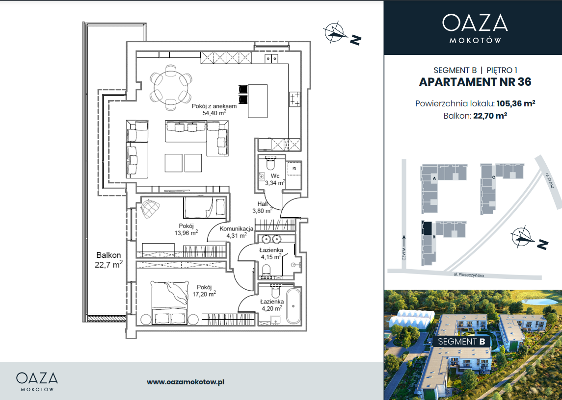 Inwestycja Oaza Mokotów zlokalizowana jest w ścisłym centrum Mokotowa, przy ulicy Piaseczyńskiej 41, w sąsiedztwie terenów zielonych oraz rekreacyjnych Klubu Sportowego Warszawianka – boiska sportowe, korty tenisowe oraz Park Wodny ze strefą Spa & Wellness. Od strony zachodniej nieruchomość przylega do przepięknej skarpy o wysokości kilkunastu metrów oraz naturalnego stawu. W pobliżu znajdują się liczne kawiarnie i popularne restauracje, które ściągają gości z całej Warszawy.