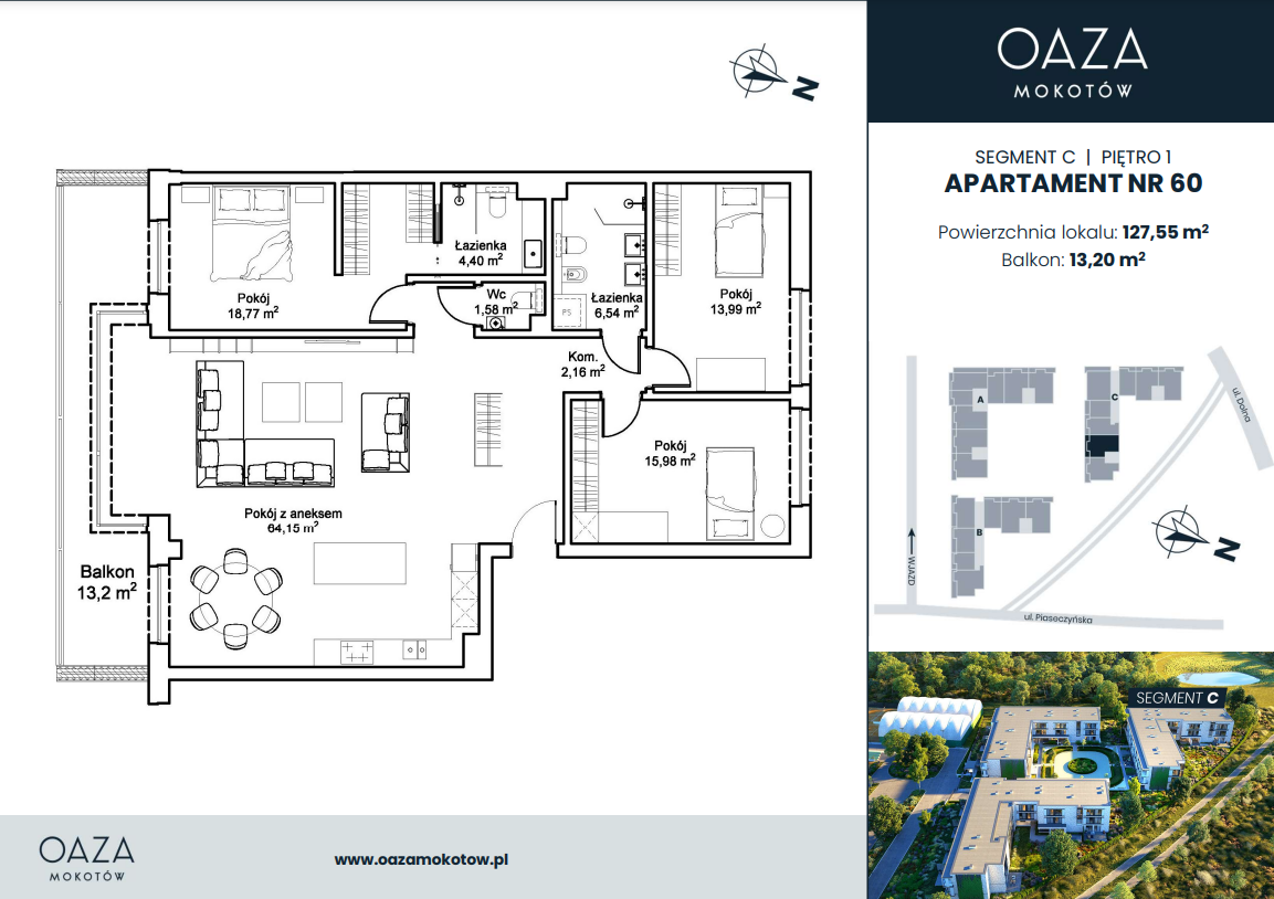 Inwestycja Oaza Mokotów zlokalizowana jest w ścisłym centrum Mokotowa, przy ulicy Piaseczyńskiej 41, w sąsiedztwie terenów zielonych oraz rekreacyjnych Klubu Sportowego Warszawianka – boiska sportowe, korty tenisowe oraz Park Wodny ze strefą Spa & Wellness. Od strony zachodniej nieruchomość przylega do przepięknej skarpy o wysokości kilkunastu metrów oraz naturalnego stawu. W pobliżu znajdują się liczne kawiarnie i popularne restauracje, które ściągają gości z całej Warszawy.