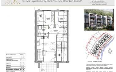 Inwestycja składa się z 12 domów jednorodzinnych w zabudowie szeregowej. W każdym znajdują się 3 mieszkania o powierzchni 63m2 i 66m2. Apartamenty na parterze posiadają tarasy, natomiast mieszkania powyżej wyposażono w przestronne balkony. W każdym budynku znajduje się wspólne pomieszczenie do przechowywania sprzętu narciarskiego lub rowerów. Wokół nieruchomości usytuowany będzie prywatny parking. Lokale na pierwszym i drugim piętrze można łączyć na jeden duży penthouse 130m z dwoma balkonami i prywatną klatką schodową - która jest dodawana gratis do mieszkań.