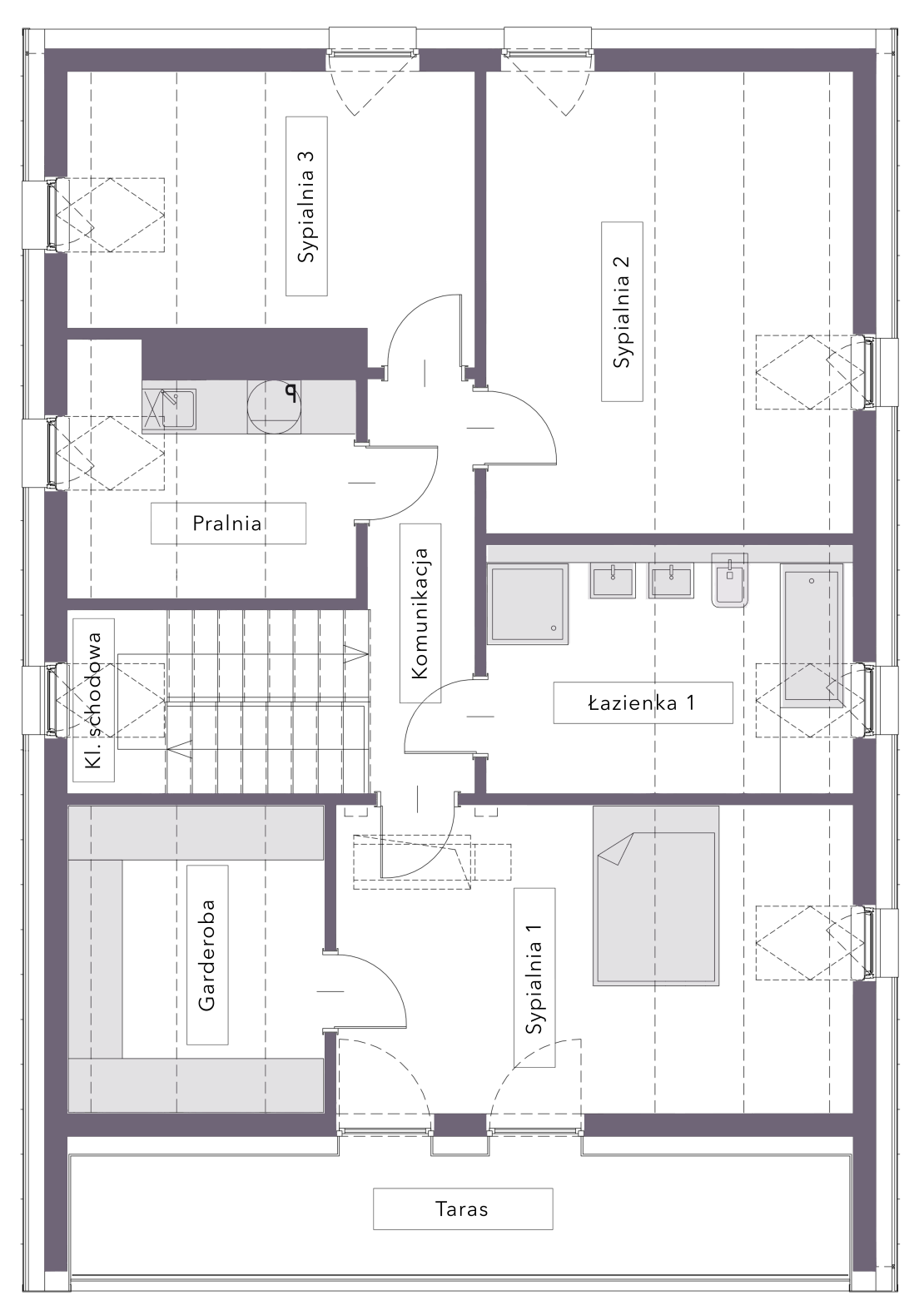 Taras (balkon) – izolacja przeciwwilgociowa- EPDM, pianka PIR 15 cm, kliny spadkowe, folia PE (rozwiązanie wg systemu dostawcy tarasu).