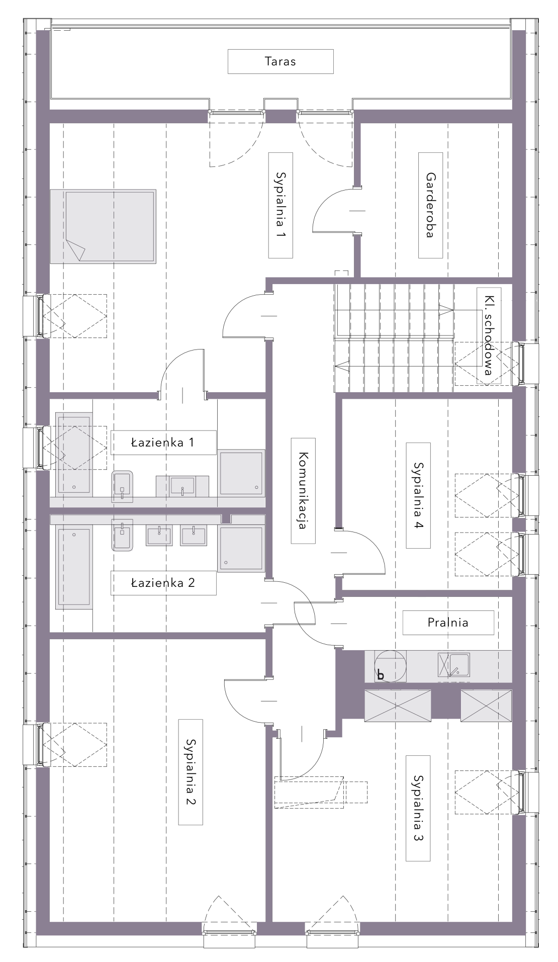 Taras (balkon) – izolacja przeciwwilgociowa- EPDM, pianka PIR 15 cm, kliny spadkowe, folia PE (rozwiązanie wg systemu dostawcy tarasu).