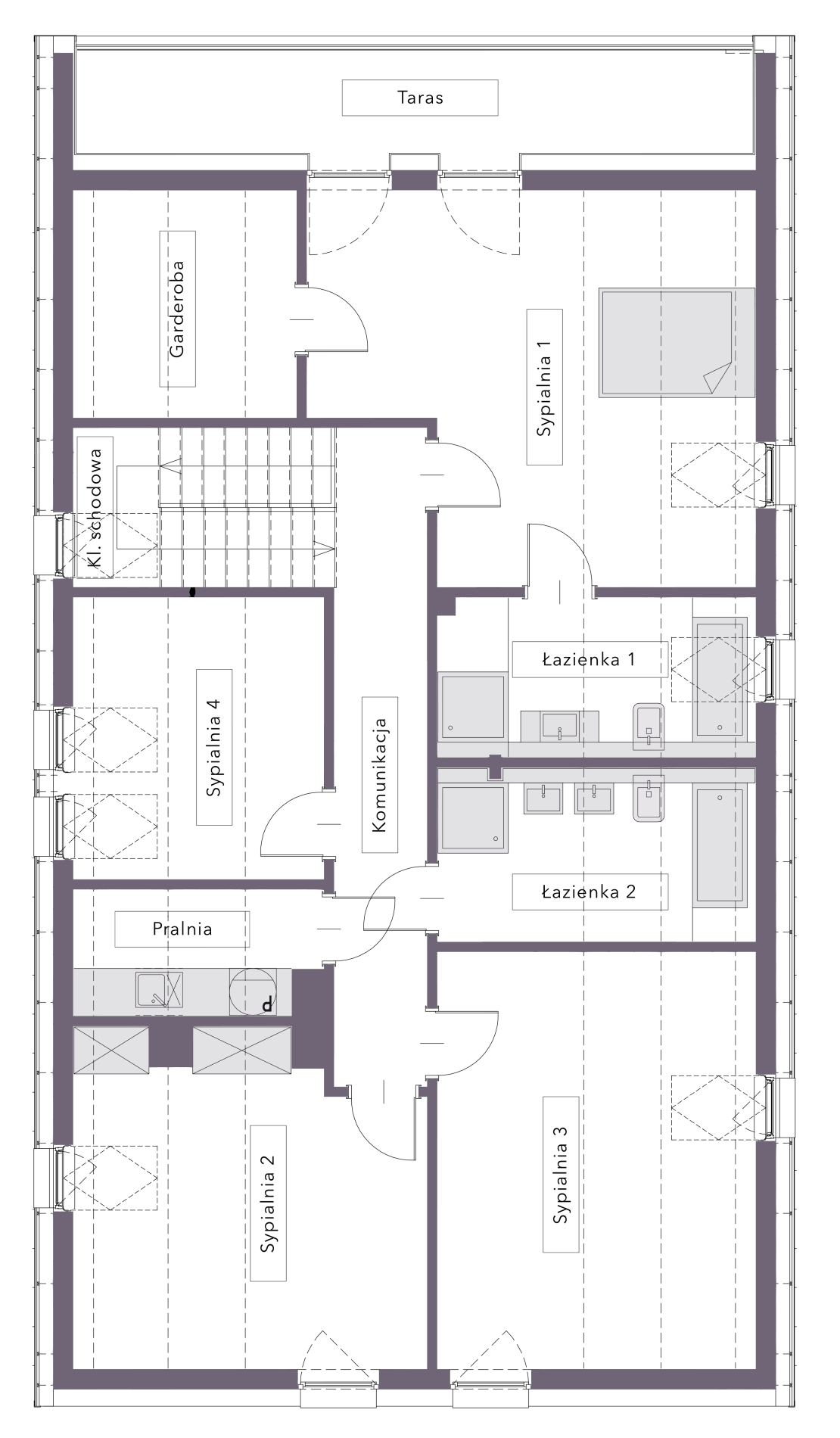 Taras (balkon) – izolacja przeciwwilgociowa- EPDM, pianka PIR 15 cm, kliny spadkowe, folia PE (rozwiązanie wg systemu dostawcy tarasu).