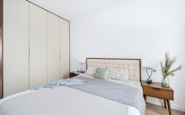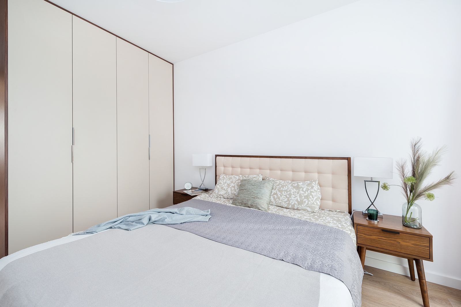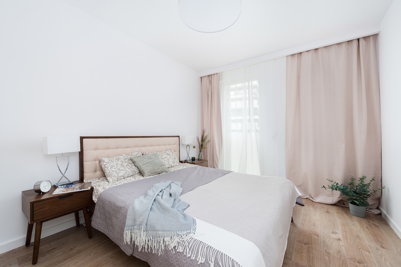 W przytulnej sypialni stoją pełnowymiarowe łóżko z materacem, stoliki nocne i pojemna szafa wykonana na wymiar.