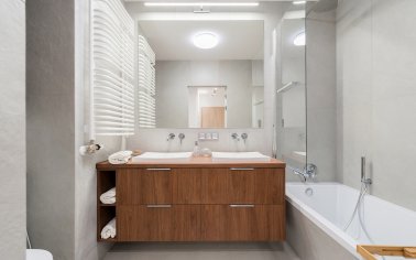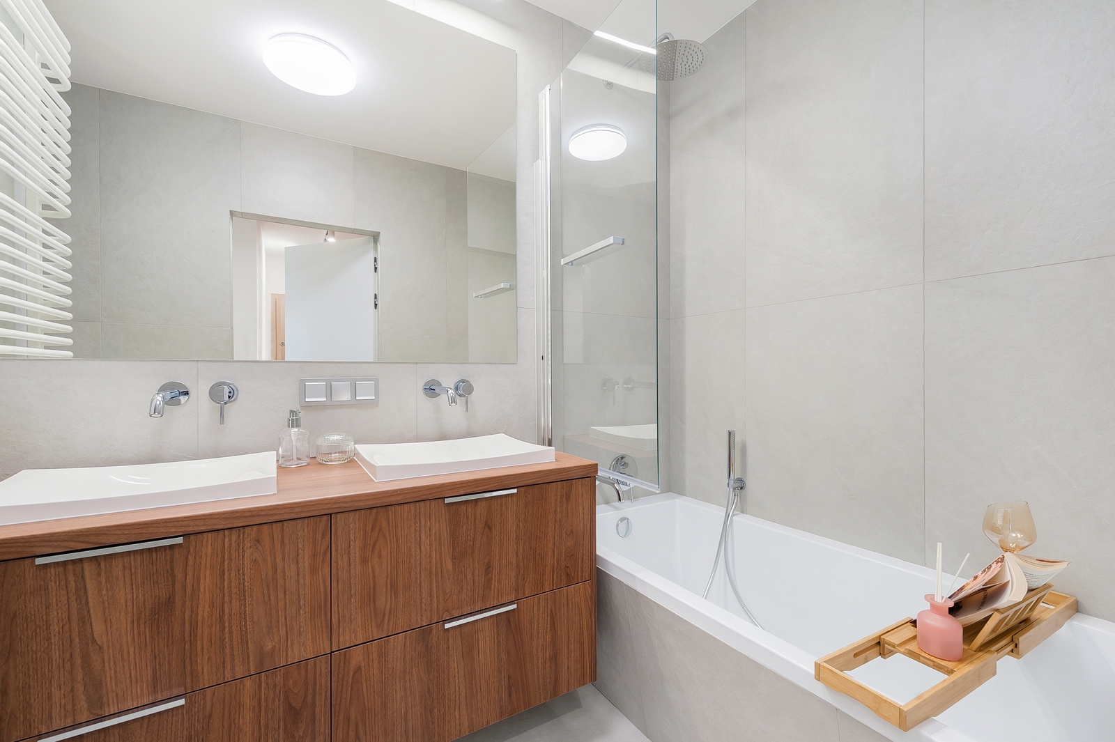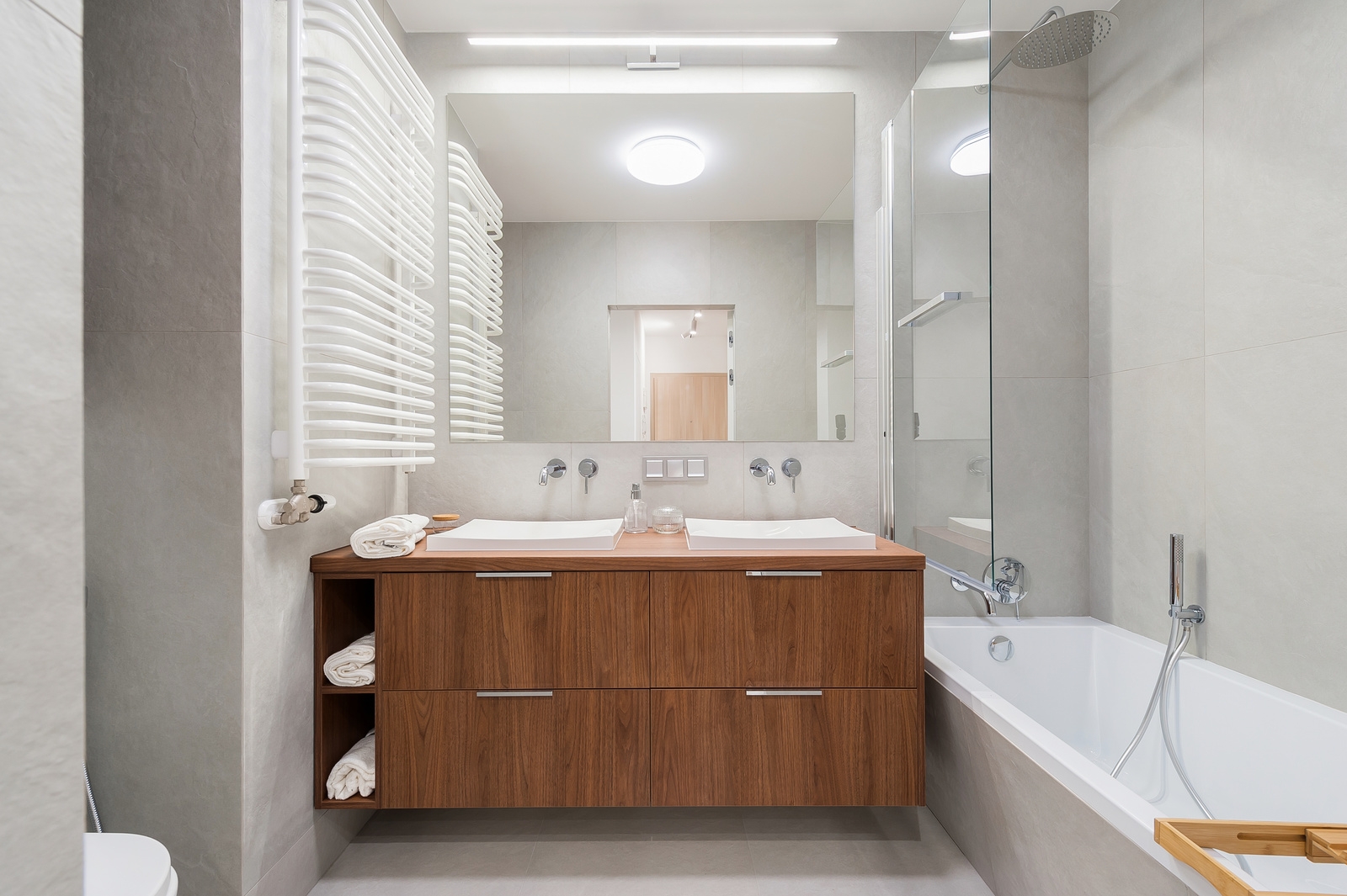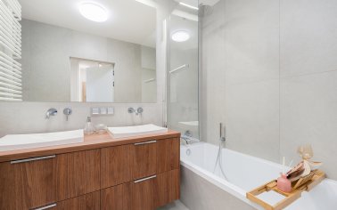 W łazience znajduje się wanna, podwójna umywalka z eleganckimi bateriami podtynkowymi Grohe i podwieszane WC.