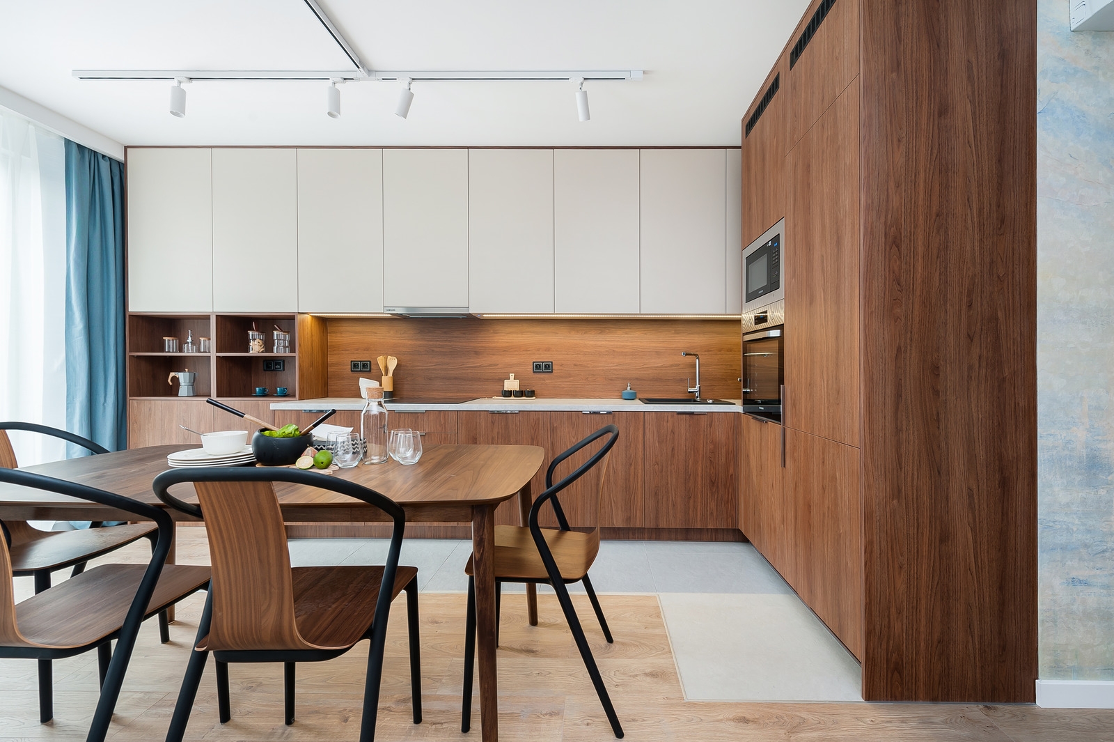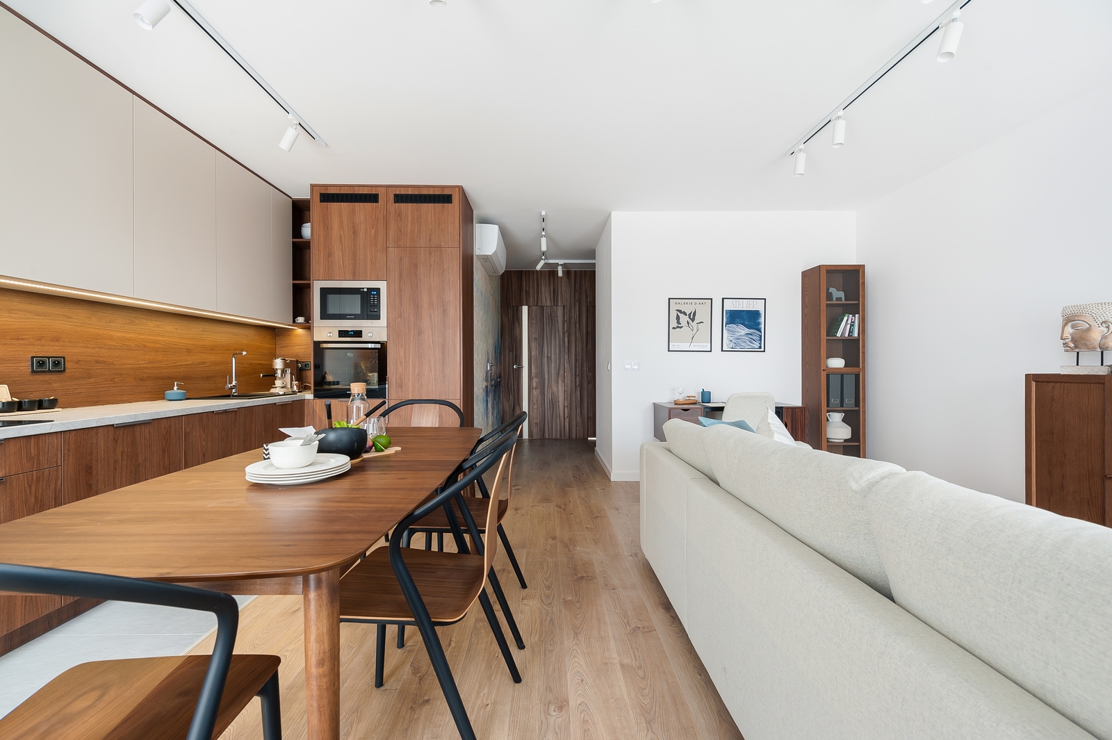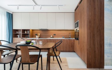 Kuchnia wykonana na wymiar przez stolarza i wyposażona w wysokiej klasy sprzęt AGD firmy Samsung i Bosch: płyta indukcyjna, lodówka, piekarnik, kuchenka mikrofalowa, okap oraz zmywarka.
