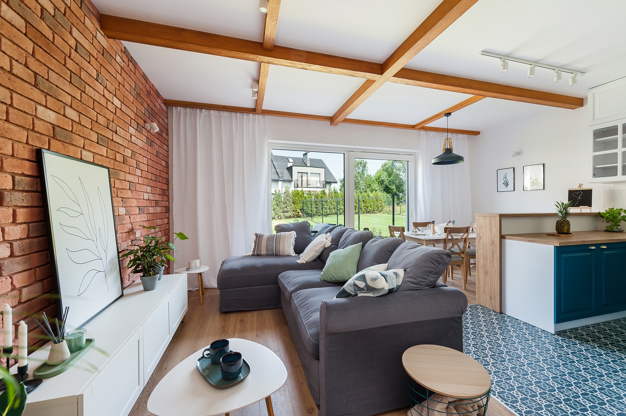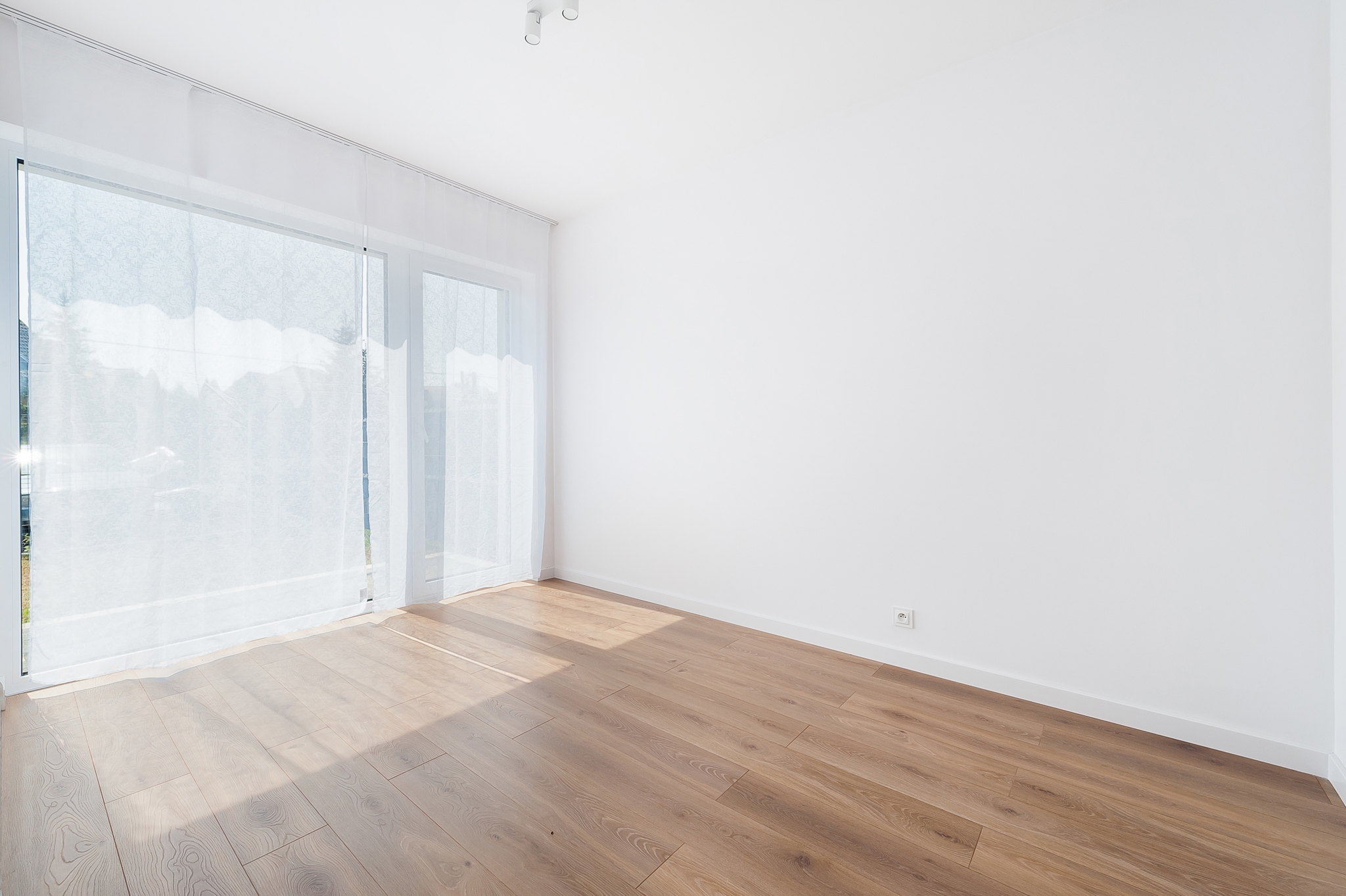 Dodatkowo na parterze znajduje się mała sypialnia z dużymi przeszkleniami, która idealnie sprawdzi się jako pokój dla gości lub gabinet.
