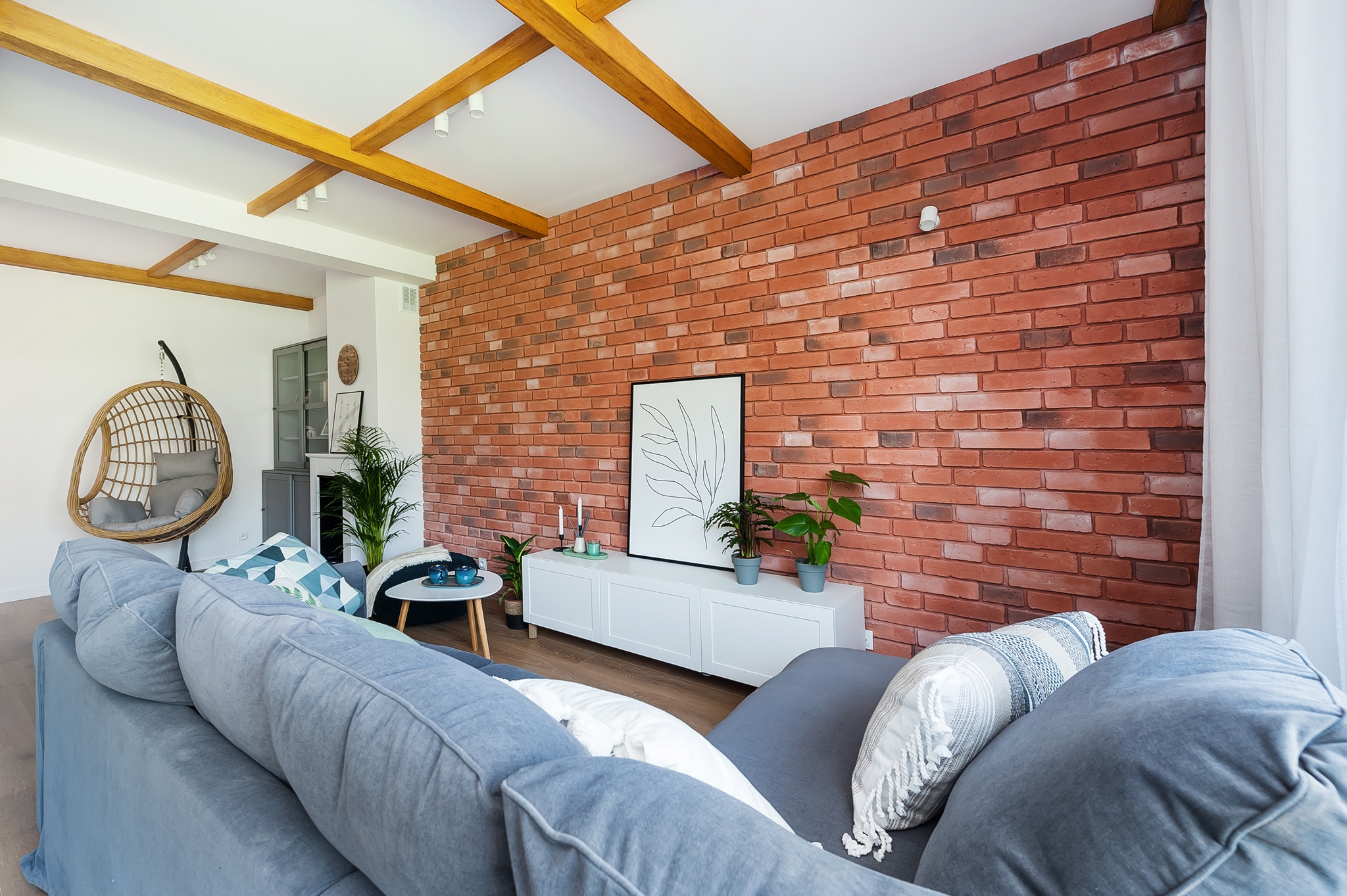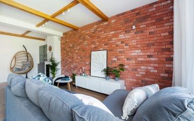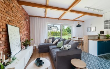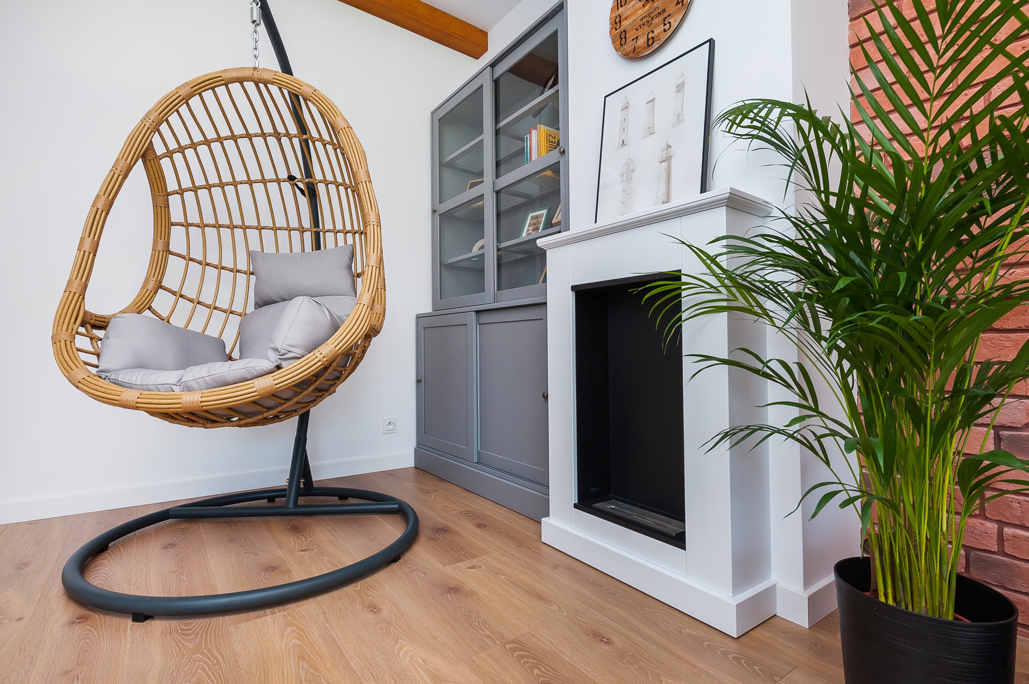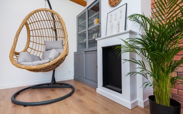 W salonie wygodna, duża kanapa z funkcją spania, stolik kawowy oraz wygodny, podwieszany fotel bezpośrednio przy biokominku.