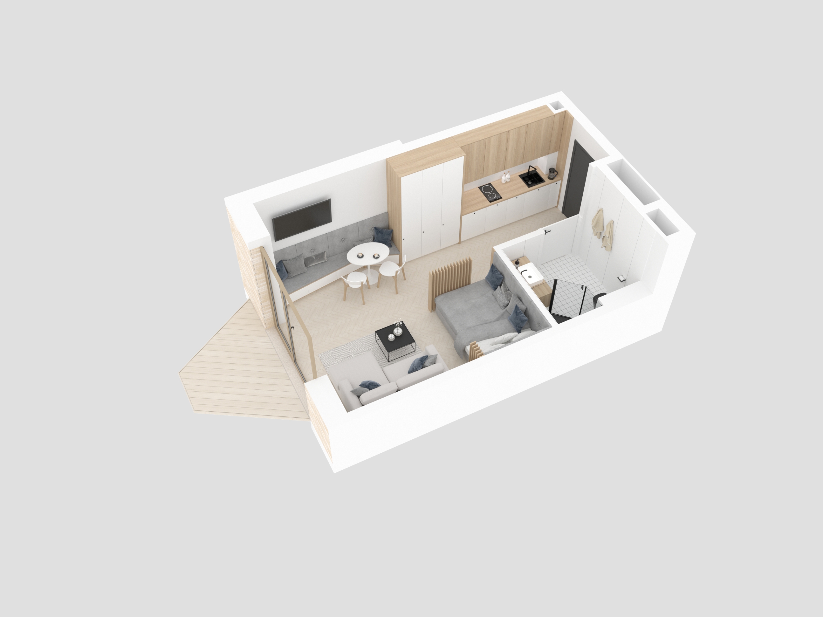 - pokój dzienny z aneksem kuchennym o pow. 19,42 m kw.,