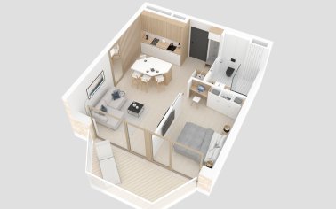 - przestronny pokój dzienny z aneksem kuchennym o pow. 22,21 m kw. z wyjściem na taras,