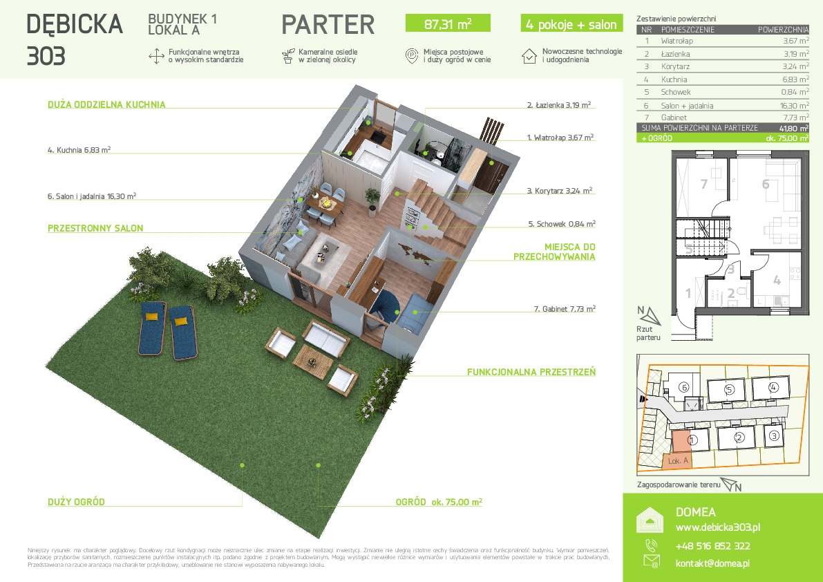 Doskonała lokalizacja inwestycji zapewnia dogodny dojazd do autostrady i drogi ekspresowej. Dojazd do centrum Rzeszowa to niecałe 10 minut. Tuż obok Dębickiej 303 znajduje się duże osiedle, na którym nie brakuje sklepów i punktów usługowych.