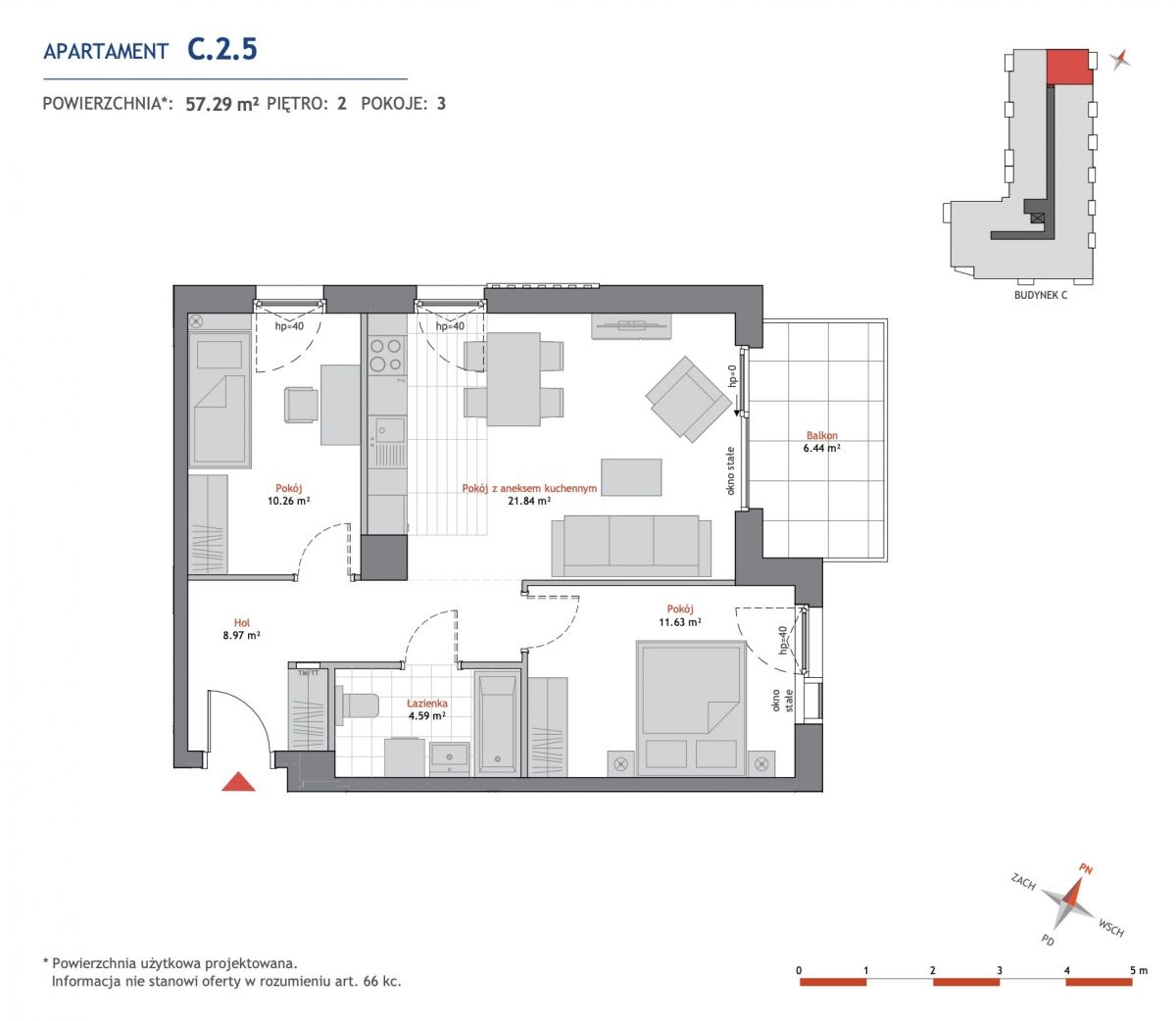Apartament 3 pokojowy o powierzchni 57,29 m2, z ekspozycją północno-wschodnią, usytuowany na II piętrze. Salon z aneksem kuchennym (21,84 m2) posiada wyjście przez przesuwne drzwi na balkon o powierzchni 6,44 m2. W apartamencie znajdują się dwie sypialnie (10,26 m2 i 11,63 m2) oraz łazienka (4,59 m2).