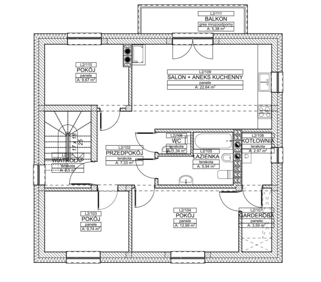 Do metrażu nie zalicza się poddasze o powierzchni ok. 20m2 - do własnej adaptacji.