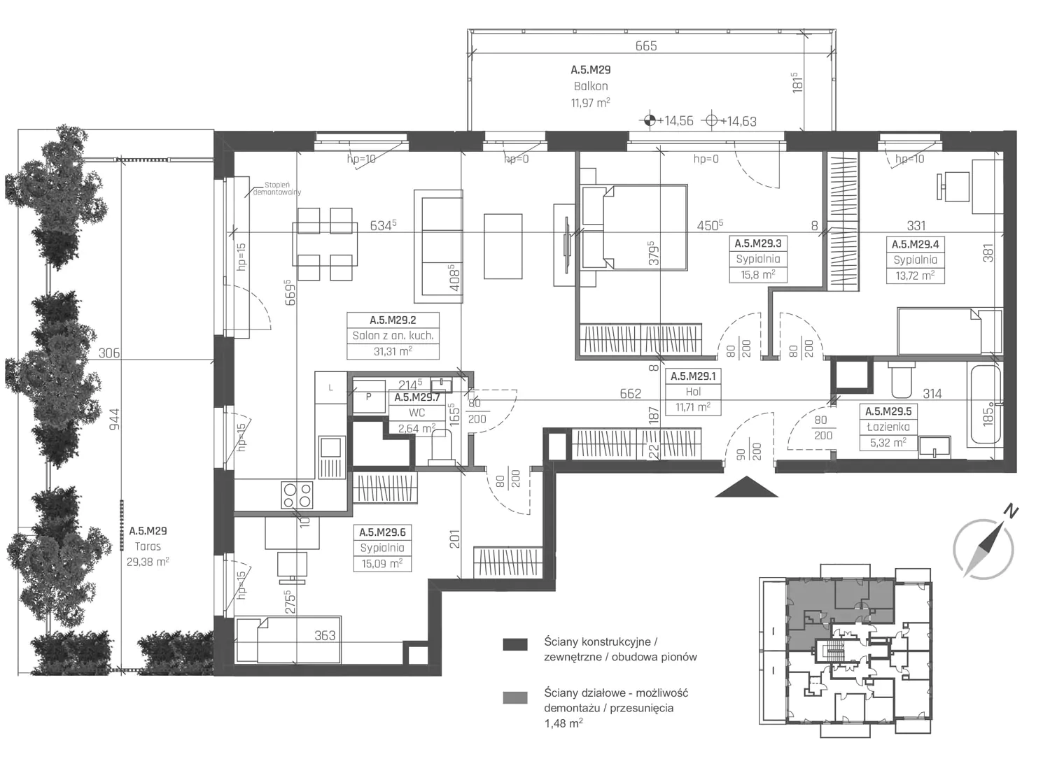 Balkon: 11.97 m2Taras: 29.38 m2
