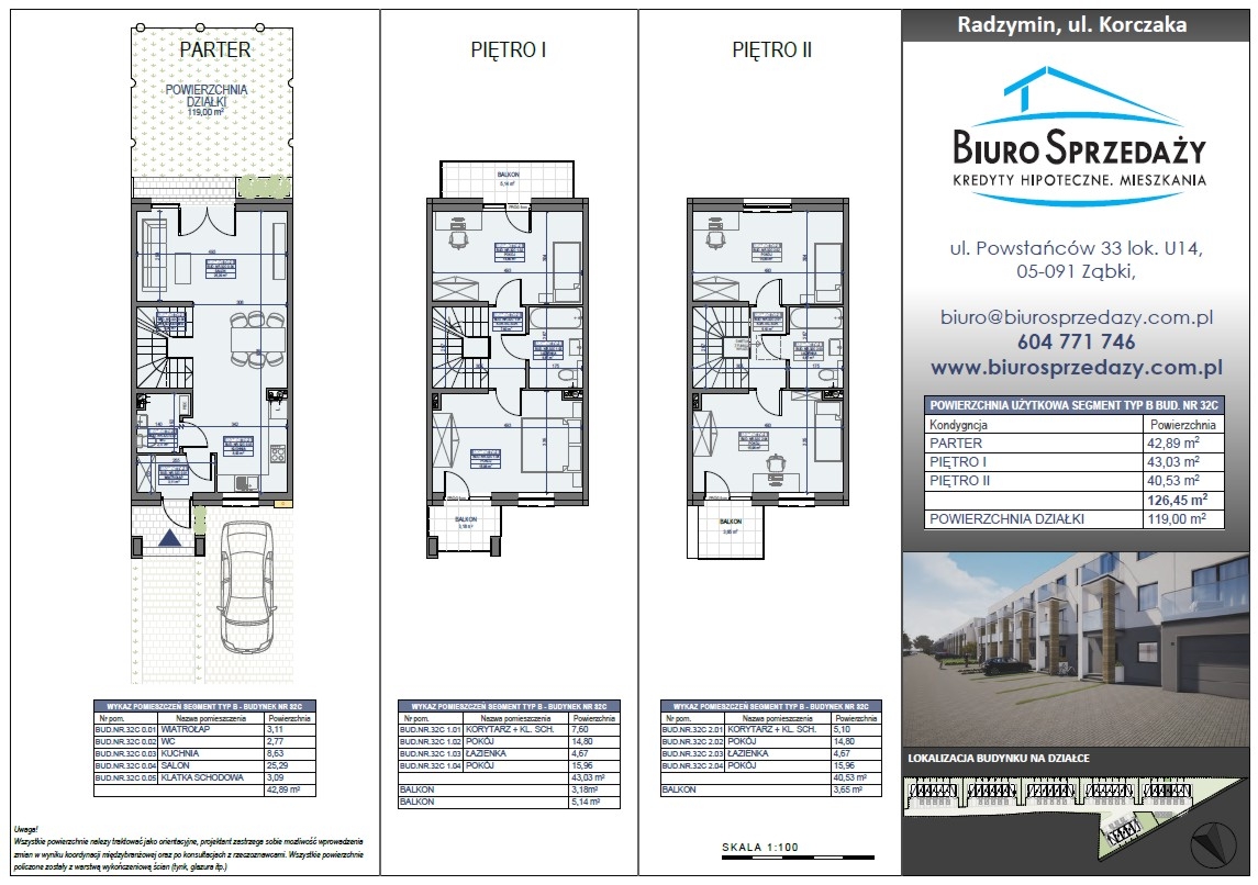 Budynki środkowe z własną działką i miejscem parkingowym o powierzchni użytkowej 126,45 m2, w skład budynku wchodzą: