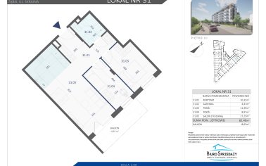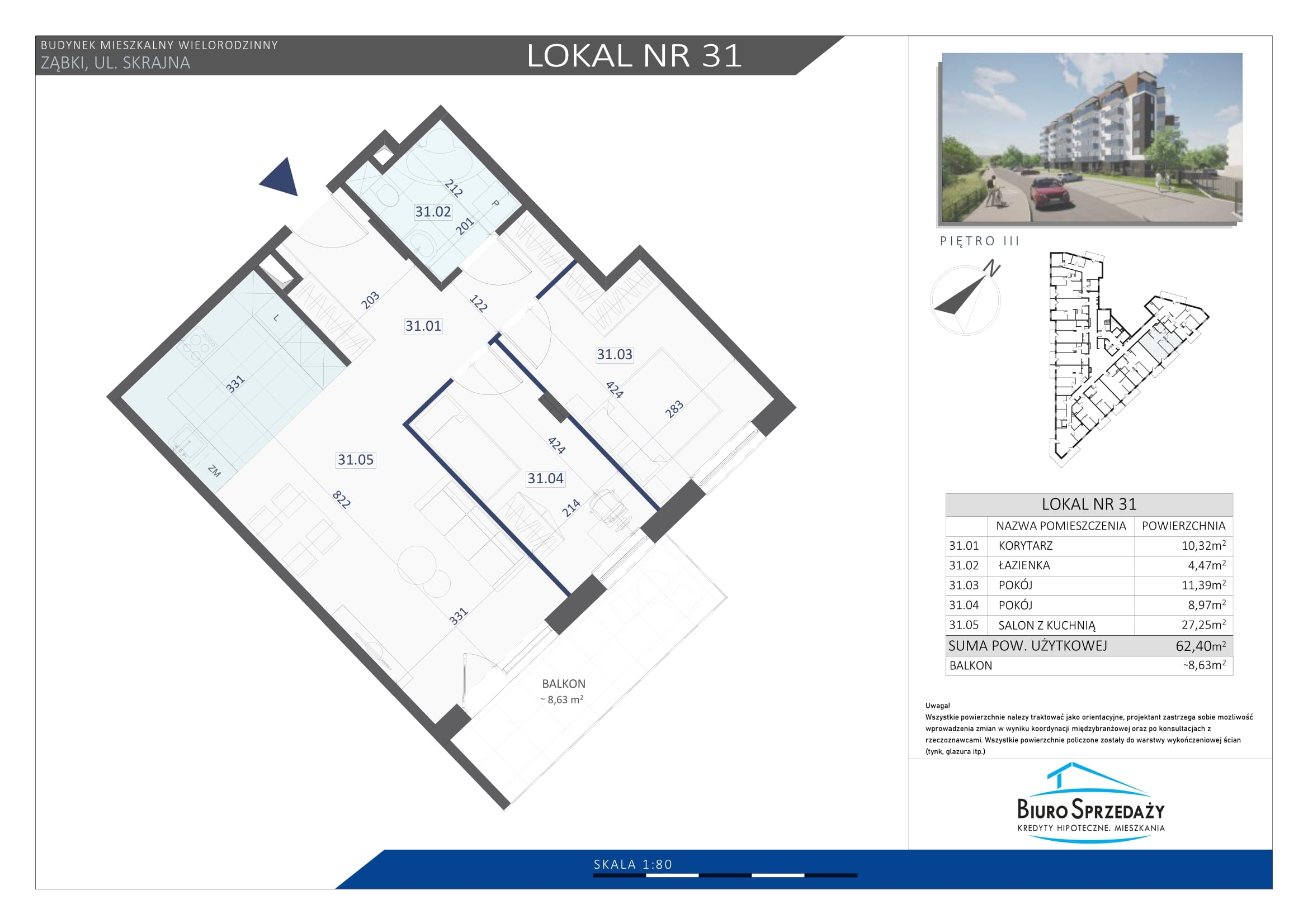Całkowita powierzchnia mieszkania: 62,40 m²