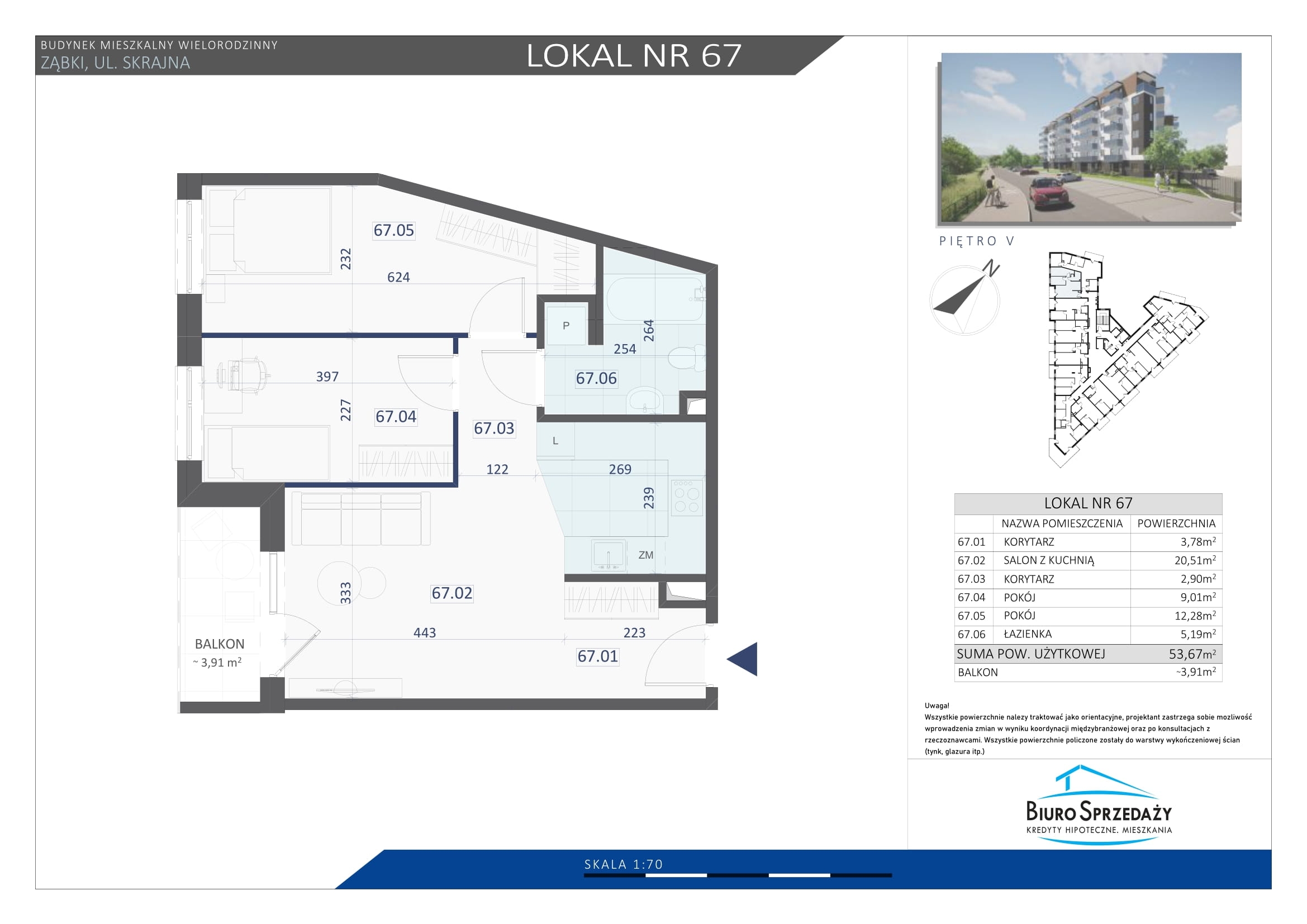 Całkowita powierzchnia mieszkania: 53,67 m²