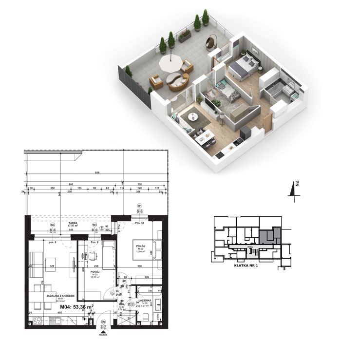 Całkowita powierzchnia mieszkania: 53,36 m²