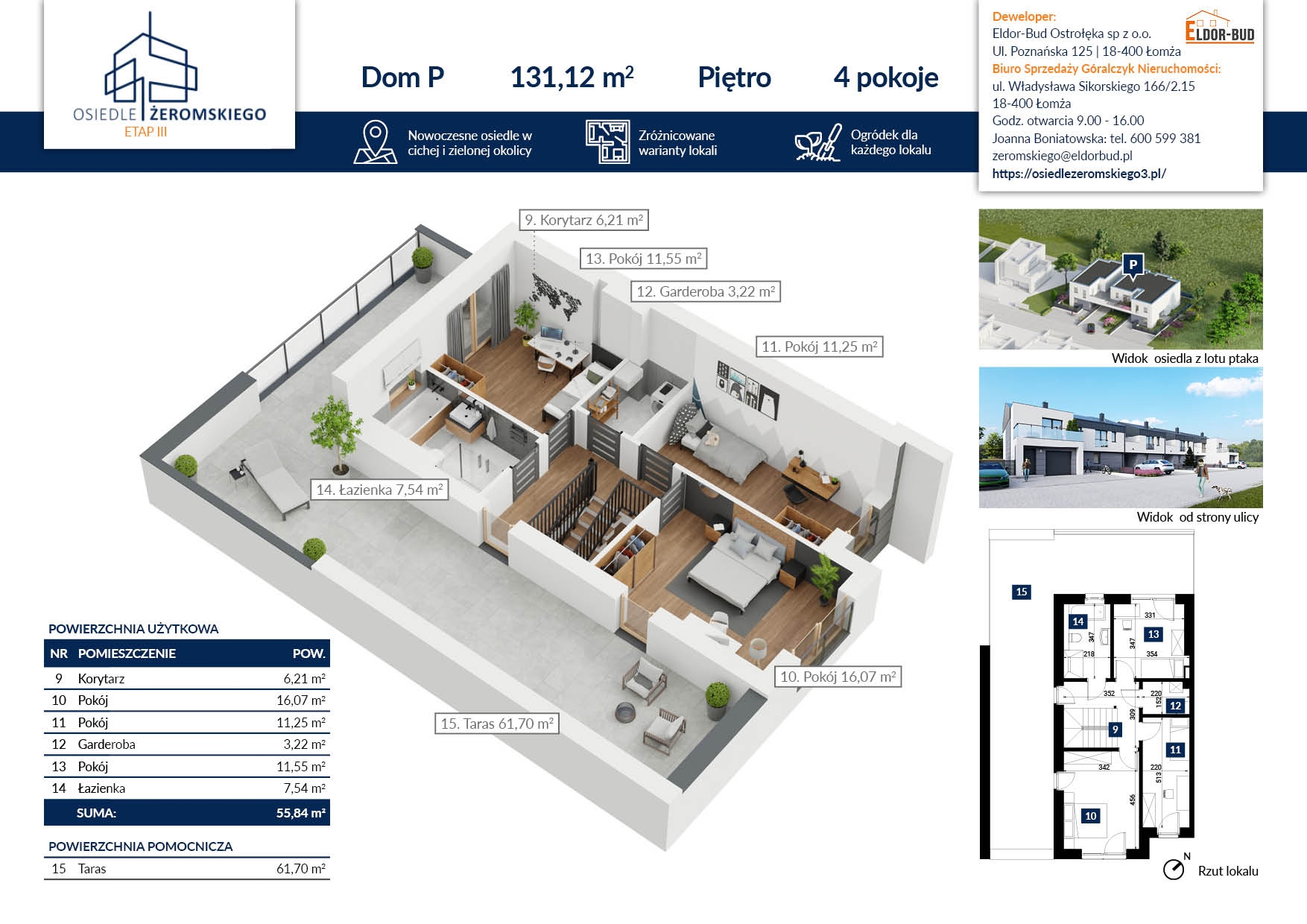 Osiedle położone jest z dala od blokowisk i blisko natury. Dzięki terenom zielonym można cieszyć się zdrowym klimatem oraz czystym powietrzem o każdej porze roku. Budynki wyróżniają się nowoczesną, miłą dla oka architekturą. Mają duże okna, dzięki czemu o każdej porze dnia do wnętrz wpada mnóstwo naturalnego światła. Osiedle Żeromskiego jest znakomitym miejscem dla rodzin z dziećmi, młodych par oraz seniorów. Można znaleźć tutaj nie tylko codzienną wygodę, ale i atmosferę, która sprzyja realizowaniu swoich planów. Wszystkie domy wyróżniają się przemyślanym układem pomieszczeń, zapewniającym domownikom przestrzeń do odpoczynku, pracy, nauki czy zabawy.
