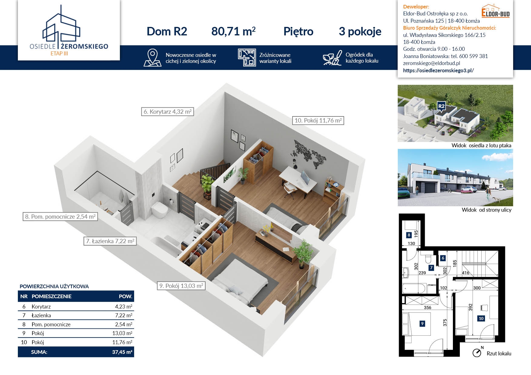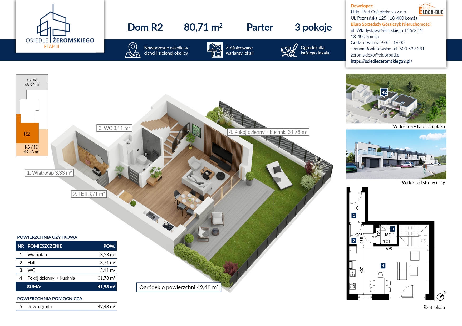 Osiedle położone jest z dala od blokowisk i blisko natury. Dzięki terenom zielonym można cieszyć się zdrowym klimatem oraz czystym powietrzem o każdej porze roku. Budynki wyróżniają się nowoczesną, miłą dla oka architekturą. Mają duże okna, dzięki czemu o każdej porze dnia do wnętrz wpada mnóstwo naturalnego światła. Osiedle Żeromskiego jest znakomitym miejscem dla rodzin z dziećmi, młodych par oraz seniorów. Można znaleźć tutaj nie tylko codzienną wygodę, ale i atmosferę, która sprzyja realizowaniu swoich planów. Wszystkie domy wyróżniają się przemyślanym układem pomieszczeń, zapewniającym domownikom przestrzeń do odpoczynku, pracy, nauki czy zabawy.